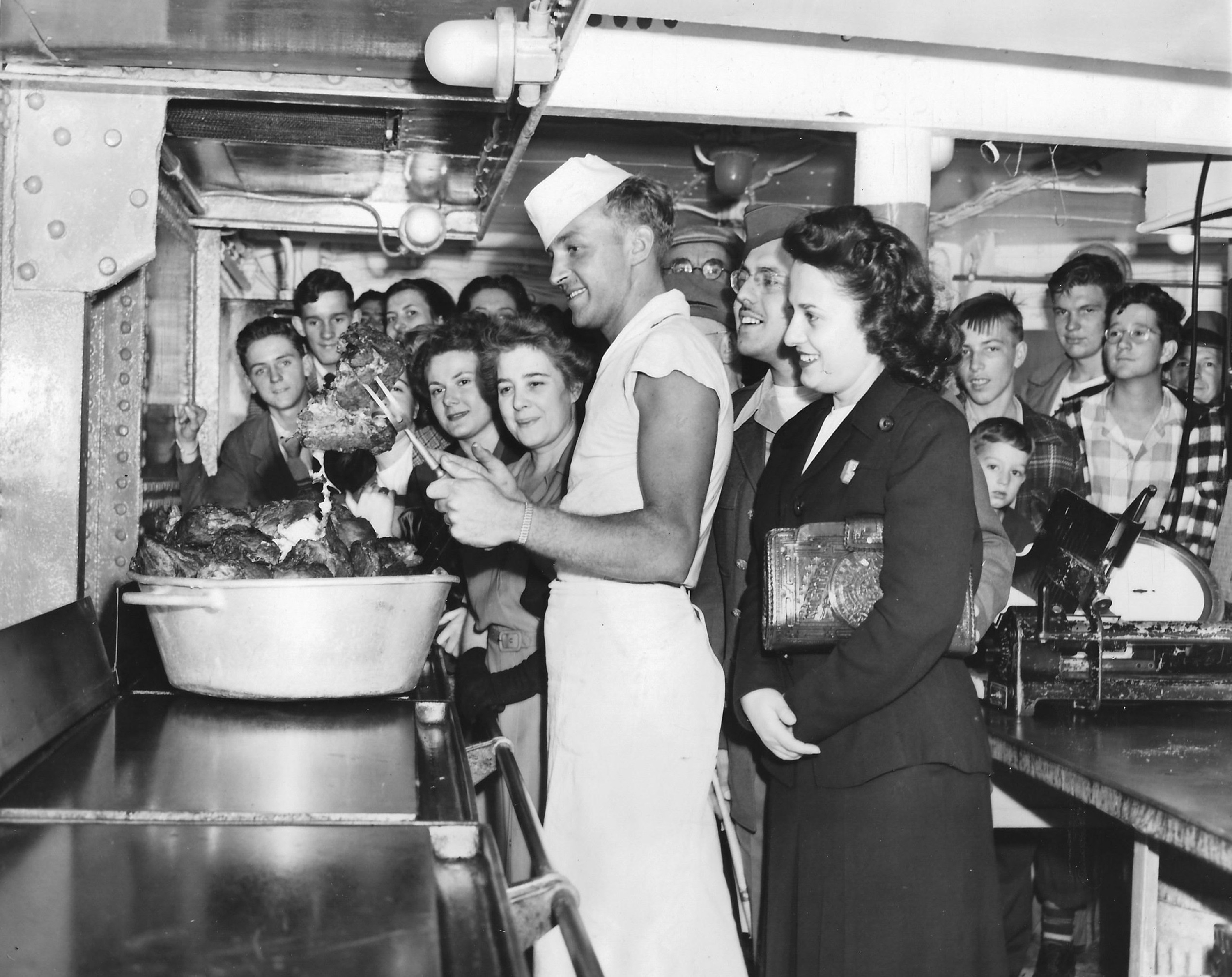 ![]() 2.45k | New York City (19 October 1945): SC/2 Chester Smigielski, of Chelsea, Massachusetts, holds up an appetizing hunk of meat for spectators to see during the public inspection tour of the battleship New York (BB-34), which docked in New York this morning. The public was permitted aboard in the afternoon. | Photo courtesy of Acme Newspictures via Bill Gonyo.