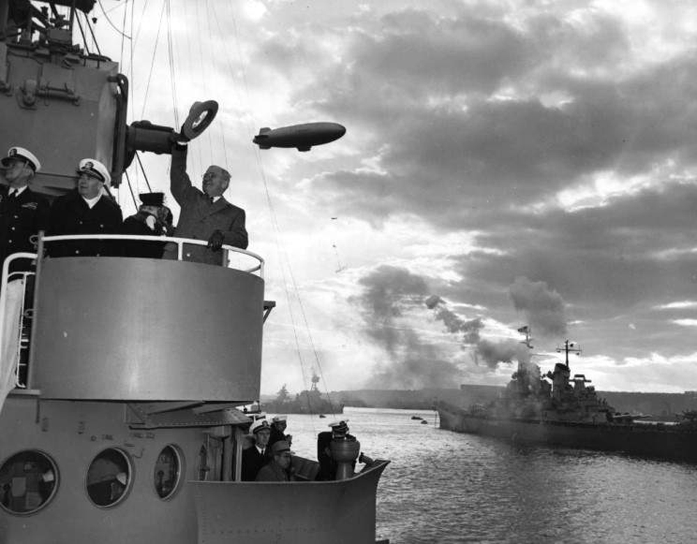 ![]() 252k | President Harry S Truman waves from the Missouri (BB-63). The New York (BB-34) is in the background and off the bow. | USN photo courtesy of Scott Koen & ussnewyork.com. |
