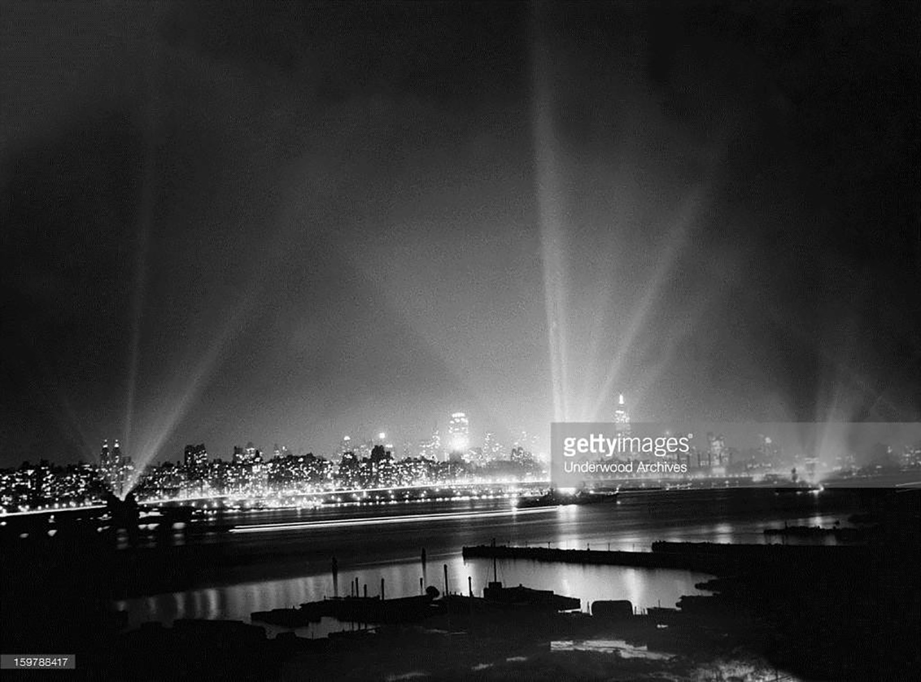 | ![]() 467k | Searchlights aboard the aircraft carrier Enterprise (CV-6); and battleships Missouri (BB-63) and New York (BB-34) provide fans of light from their berths in the Hudson River as the biggest Navy Day celebration in NY history commences, New York, New York, 26 October 1945. | Photo by Underwood Archives/Getty Images, courtesy of gettyimages.com. |