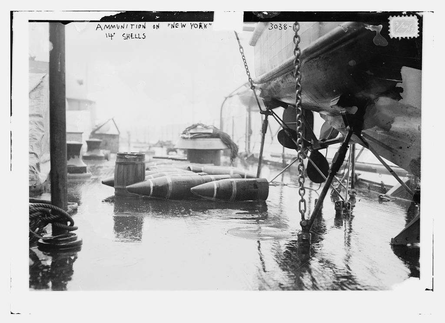 NAVY'S NEWEST DREADNOUGHT TO DO SHORE WORK AT MEXICO | THE new dreadnought New York (BB-34), the Texas (BB-35) and the Wyoming (BB-32) and from ten to twelve light draught fighting vessels, under the command of Rear Admiral Cameron M. Winslow, are to be organized into a special squadron for shore work in Mexican waters. The New York will be the flagship of the squadron. Herewith is shown the New York, strewn with ammunition for its big 14-inch guns. These are the first 14-inch guns made. Image and text provided by State Historical Society of North Dakota. |