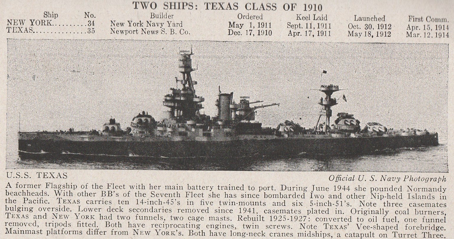 Postcard showing ship information of the New York class battleships, which included New York (BB-34) and Texas (BB-35). |