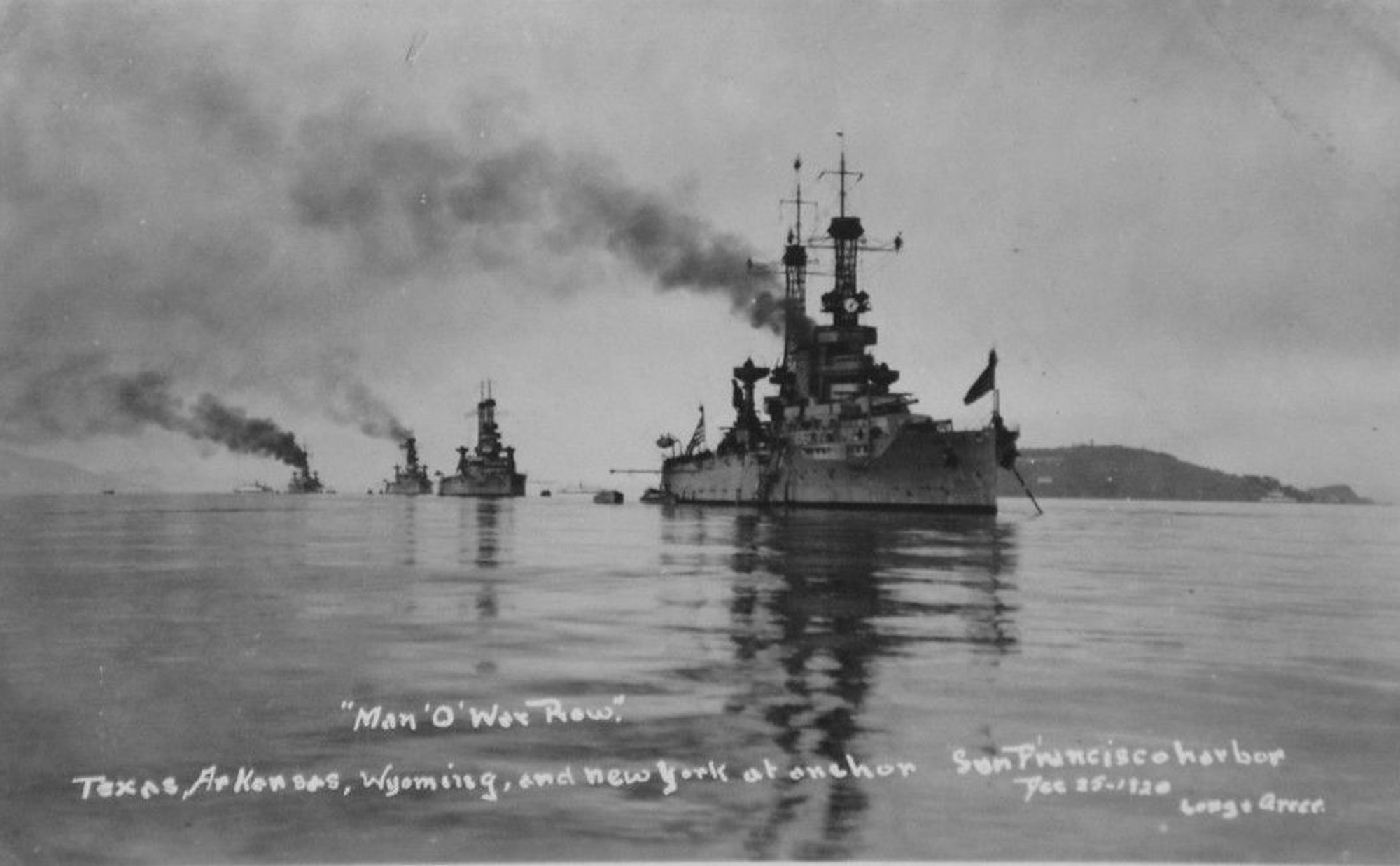 The Arkansas (BB-33) is in the left hand corner of this photo with other test ships at the Bikini Bomb Test, 1946. I believe the New York (BB-34) is in the center, and the Pennsylvania (BB-38) is to her immediate right.