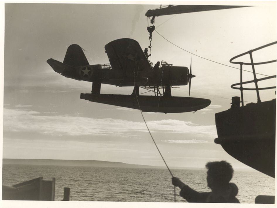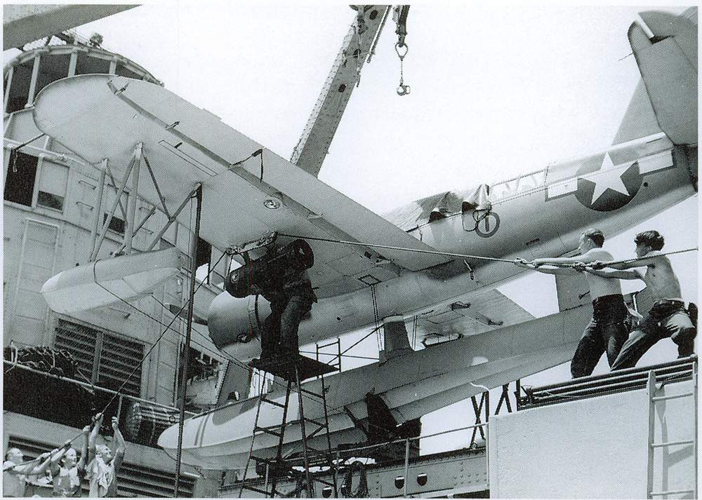 ![]() 242k | OS2U Kingfisher aboard New York (BB-34) in June 1944. Note the depth charge under the port wing. | USN photo submitted by Pieter Bakels. |