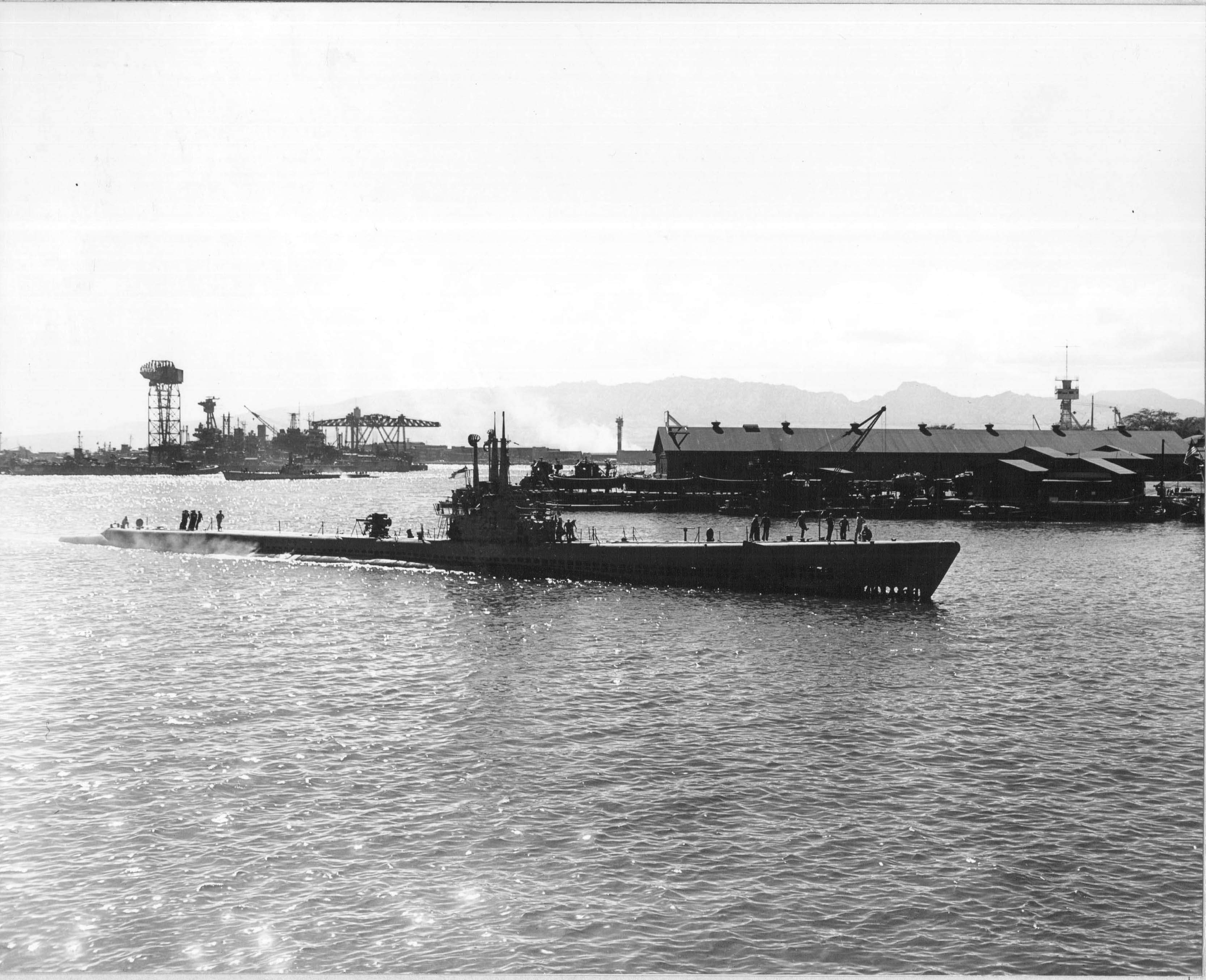 | Photo by Joseph Zayak (Vinny), former PFC, USMC, courtesy of his son Joseph Zayak. | ![]() 811k | Diablo (SS-479) as seen from the Euryale (AS-22) at Pearl Harbor, summer 1945. | What appears to be the fire control mast of the battleship New York (BB-34) rises up in the background. She left Okinawa 11 June to re gun at Pearl Harbor. The Euryale was at Pearl from 6 May – 16 August 1945. Photo i.d. courtesy of Darryl L. Baker, Dave Johnston (USNR) & Robert Morgan. |