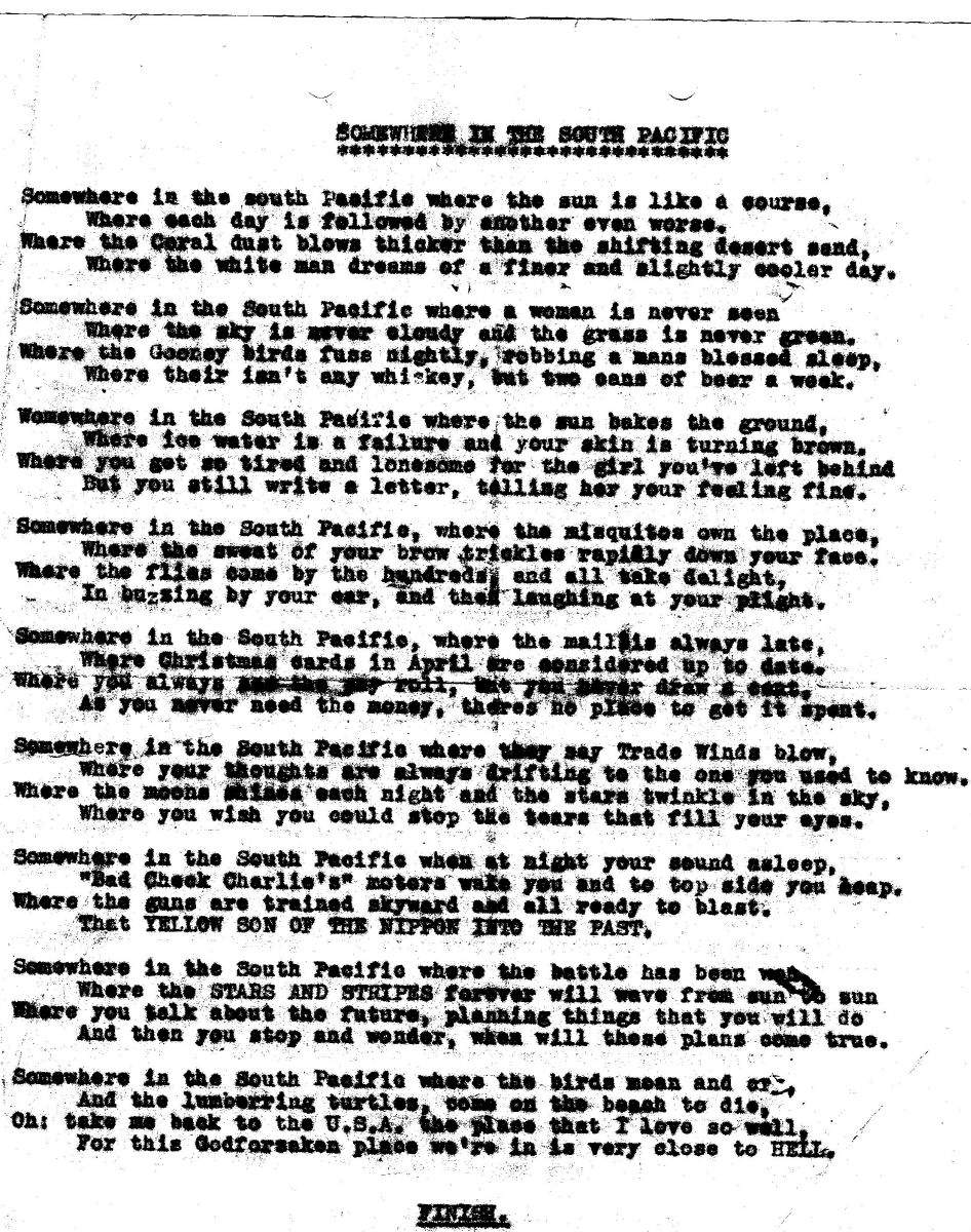 Oil on canvas painting by the artist Anthony Saunders entitled "Tennessee (BB-43) During the Landings at Iwo Jima." | In February 1945, 850 square miles of volcanic rock became the most strategically important island in the South Pacific. From Iwo Jima heavy bombers would be able to raid Japanese cities almost at will. Even with its overwhelming military might, the Americans would have to pay a heavy price for such a seemingly small island. The battleship New York (BB-34) is behind the Tennessee. Text and drawing courtesy of naval-art.com | ![]() 155k | Loading a casualty aboard a strecher. | Photo by Joseph Zayak (Vinny), former PFC, USMC, courtesy of his son Joseph Zayak. | ![]() 159k | Leaving Iwo Jima, New York (BB-34) at last repaired her propellers at Manus. She appears here at ABSD-4, some time in early March 1945 with her crew scraping & repainting her. | Photo by Joseph Zayak (Vinny), former PFC, USMC, courtesy of his son Joseph Zayak. | ![]() 117k | New York (BB-34) appears here at ABSD-4, some time in early March 1945. | Photo by Joseph Zayak (Vinny), former PFC, USMC, courtesy of his son Joseph Zayak. | ![]() 123k | I believe the officer speaking at the microphone is the captain of the New York (BB-34) & his XO who looks like the actor Lee Marvin is to his right. Probably taken on the occasion of the burial at sea for the three sailors who appear in the two photos below. | Photo by Joseph Zayak (Vinny), former PFC, USMC, courtesy of his son Joseph Zayak. | ![]() 127k | The men whose draped bodies are seen in the photos were not crew members of the New York (BB-34). They wrere transferred to the New York for treatment of their wounds suffered when their vessel, possibly an LCI was hit by Japanese shore battery. | Photo by Joseph Zayak (Vinny), former PFC, USMC, courtesy of his son Joseph Zayak. Photo i.d. & text courtesy of Peter Pane. | ![]() 117k | Burial at sea for three sailors. The first casualty is consigned to the sea. | Photo by Joseph Zayak (Vinny), former PFC, USMC, courtesy of his son Joseph Zayak. | ![]() 123k | "Somewhere in the South Pacific", author unknown. | Photo by Joseph Zayak (Vinny), former PFC, USMC, courtesy of his son Joseph Zayak. | ![]() 134k | The New York (BB-34) is shown here off Okinawa, which she reached 27 March to begin 76 consecutive days of action. She fired preinvasion and diversionary bombardments, covered landings, and gave days and nights of close support to troops advancing ashore. She did not go unscathed; a kamikaze grazed her 14 April, demolishing her spotting plane on its catapult. | Photo by Joseph Zayak (Vinny), former PFC, USMC, courtesy of his son Joseph Zayak. | ![]() 18k | Damage from a kamikazeattack on the New York (BB-34), 14 April 1945 off the coast of Okinawa. | Photo from WW II Damage Reports, courtesy of NavSea / dcfp.navy.mil. | ![]() 200k | New York (BB-34) left Okinawa 11 June to regun at Pearl Harbor.