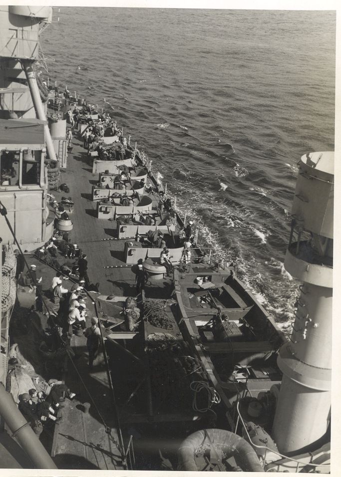 ![]() 191k | View from mainmast, looking aft., showing the now removed A.A.guns and splintershields. Only a few life rafts remain reflecting the postwar reduced crew. February, 1946. | USN photo submitted by Pieter Bakels. Photo Serial # 382-46-8. |