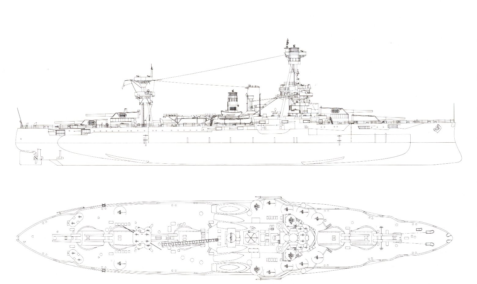 | ![]() 143k | Starboard and overhead line drawing of the New York (BB-34) in 1942. The main change since her reconstruction was the addition of many light antiaircraft weapons. | Photo and text courtesy of