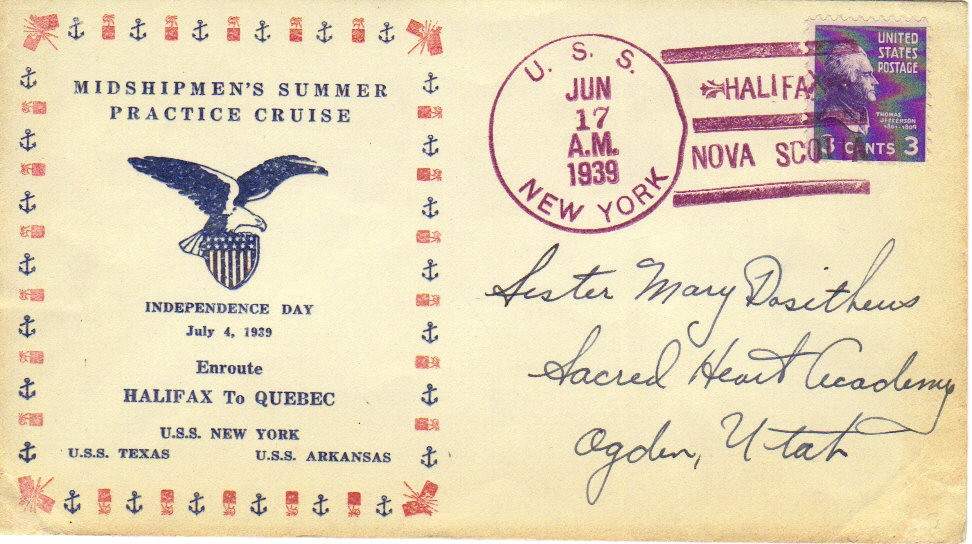 ![]() 371k | A quote made by Fleet Adm. Chester W. Nimitz is inscribed on a granite wall at the National World War II Memorial located on the National Mall in Washington, D.C. Fleet Adm. Nimitz was the United States signatory to the surrender terms aboard the battleship Missouri (BB-63) in Tokyo Bay, Japan on 2 September 1945, thus ending World War II. Established by the American Battle Monuments Commission, the memorial honors all military veterans of World War II, the citizens on the home front, the nation at large, and the high moral purpose and idealism that motivated the nation's call to arms. On 29 May 2004, the memorial was formally dedicated with an estimated 200,000 people expected to attend, and includes 100,000 visiting veterans of all wars. | USN photo # N-0295M-011 by Photographer's Mate 2nd Class Daniel J. McLain, courtesy of news.navy.mil. | ![]() 145k | Commemorative postal cover on the occasion of New York's (BB-34) 90th anniversary, 15 April 2004. | Photo courtesy of Jack Treutle (of blessed memory).