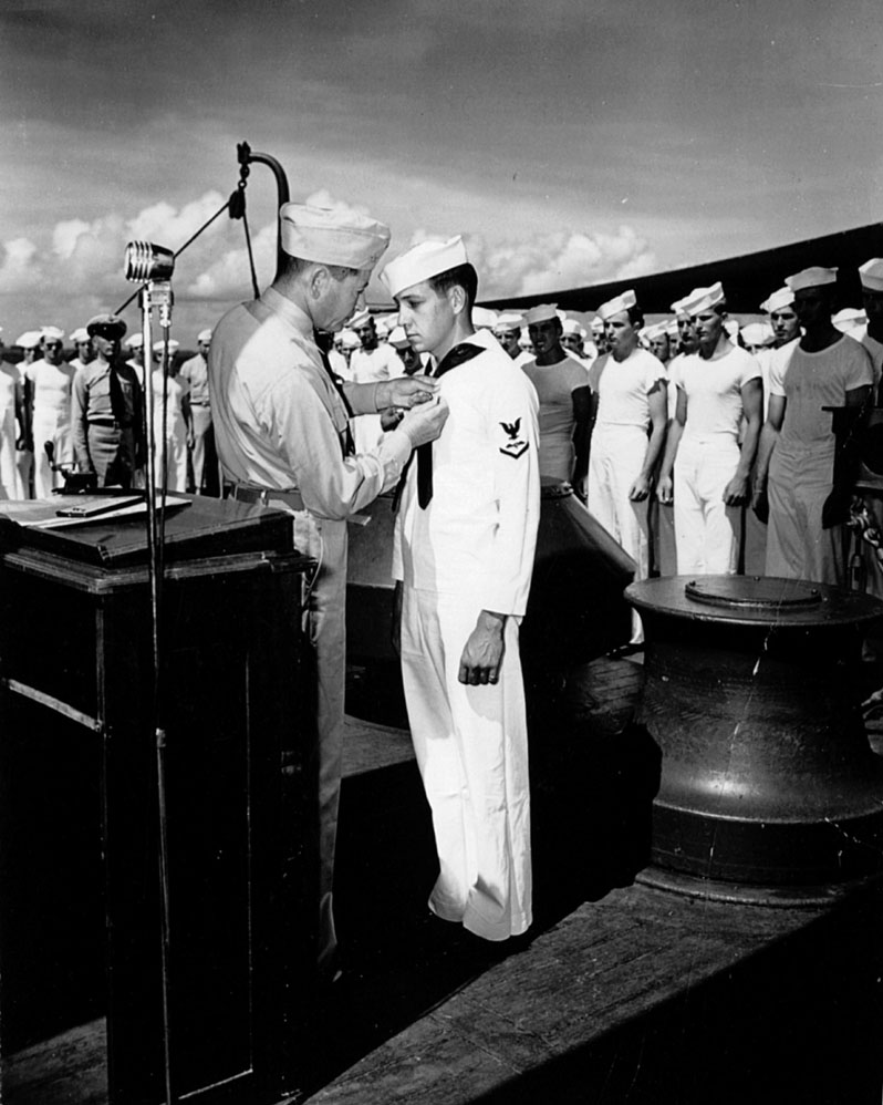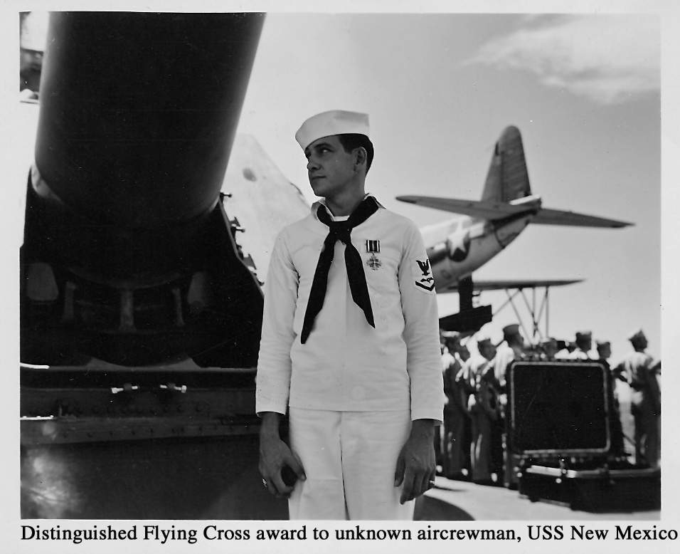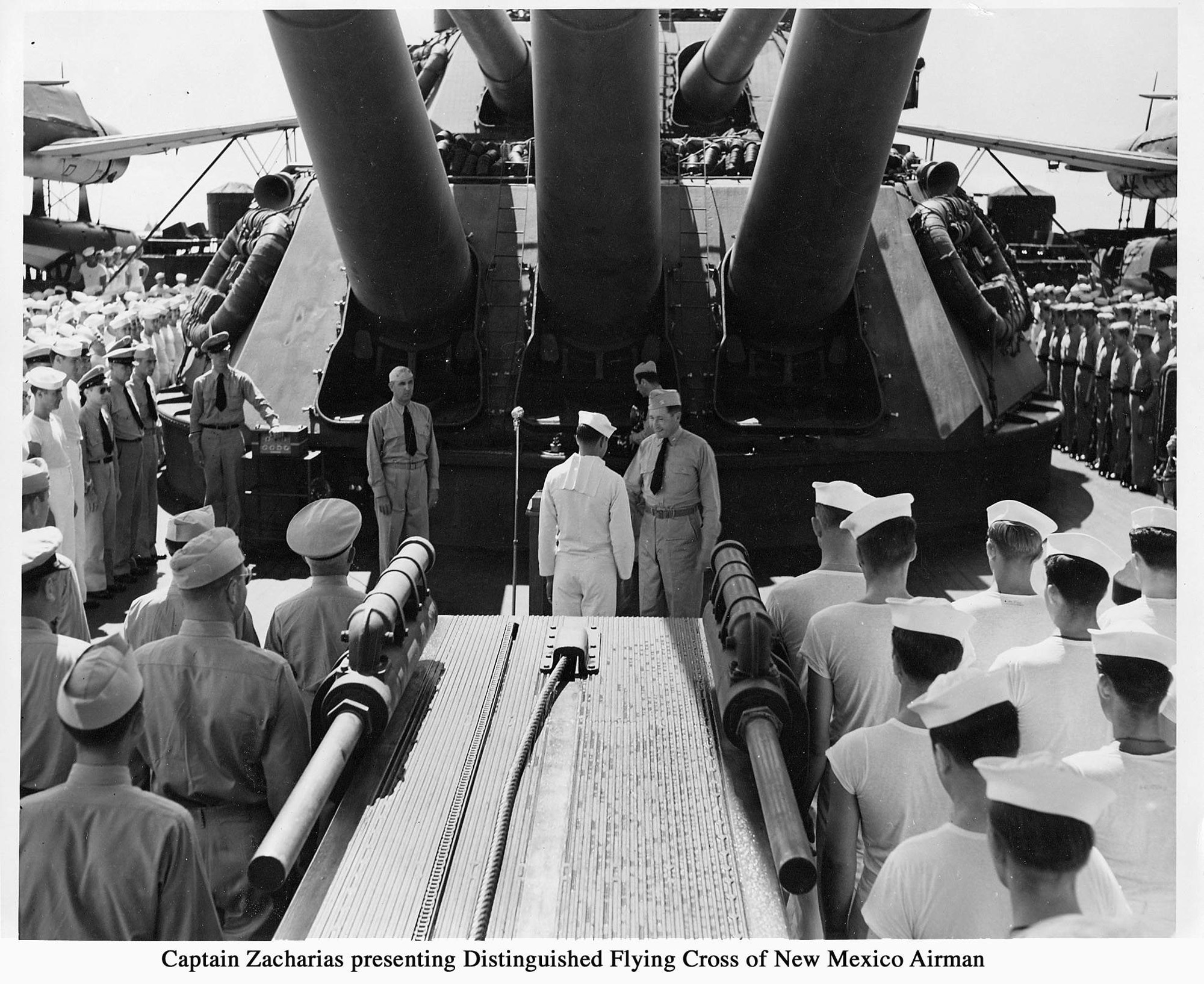 Medal presentation of the Distinguished Flying Cross (DFC) awarded to Harrison D. Miller for heroism aboard New Mexico (BB-40). |