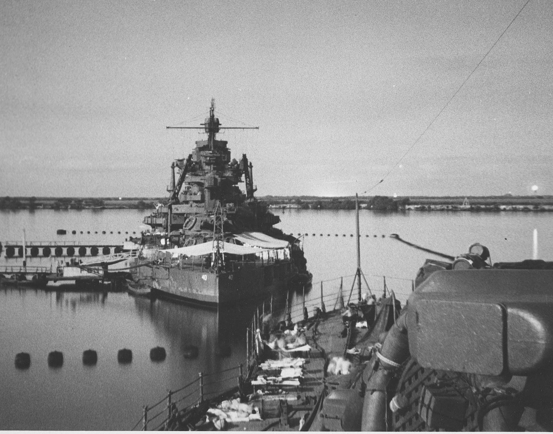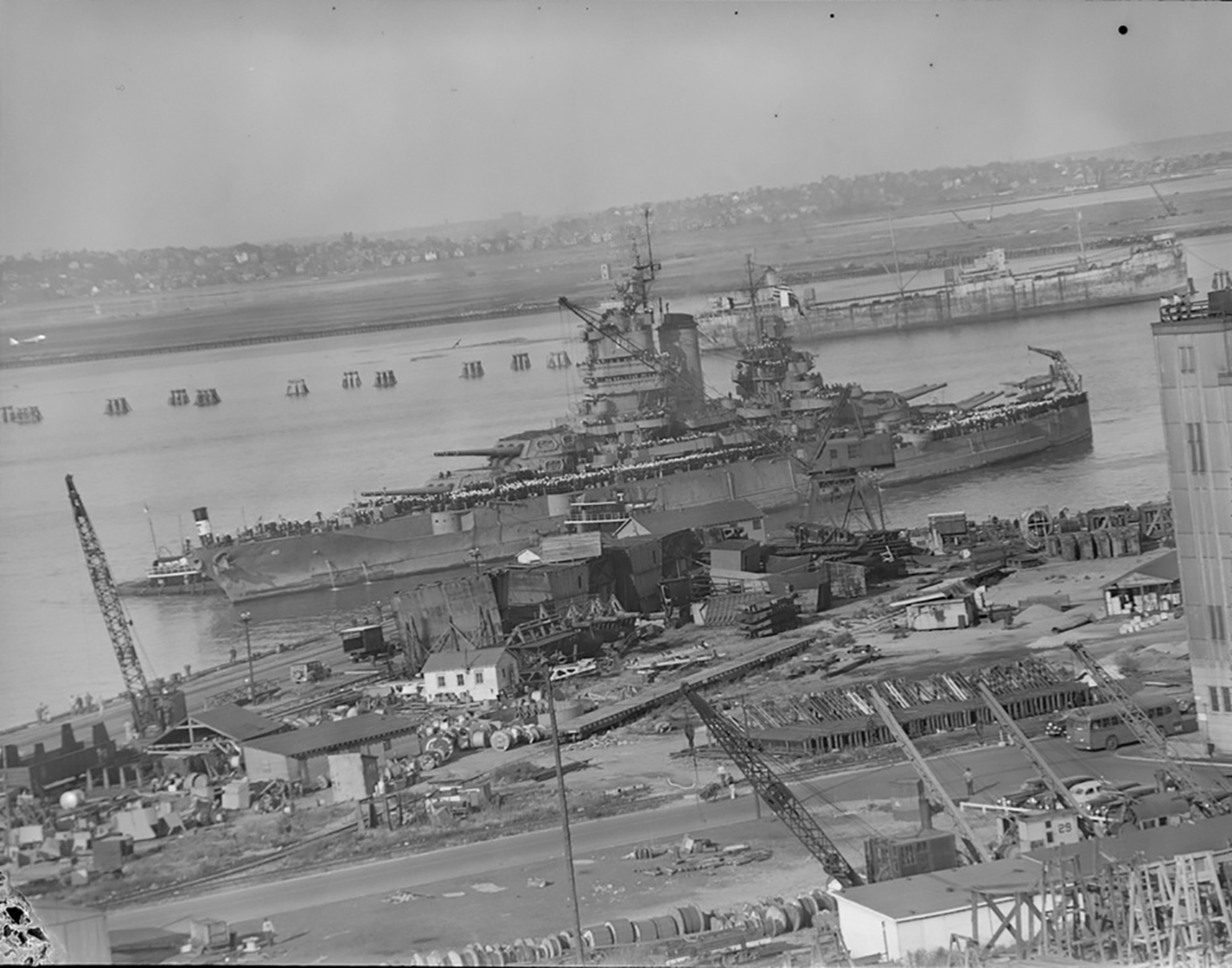 Battleship New Mexico (BB-40) being brought into Boston Navy Yard on 17 October 1945. The North Carolina (BB-55) anchored there also, and after overhaul at New York exercised in New England waters and carried Naval Academy midshipmen for a summer training cruise in the Caribbean.