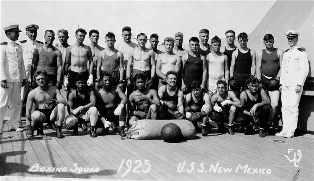 New Mexico (BB-40) Marine and sailors pose with the ship's dog mascot, probably 1919. Collection of Secretary of the Navy Josephus Daniels. |