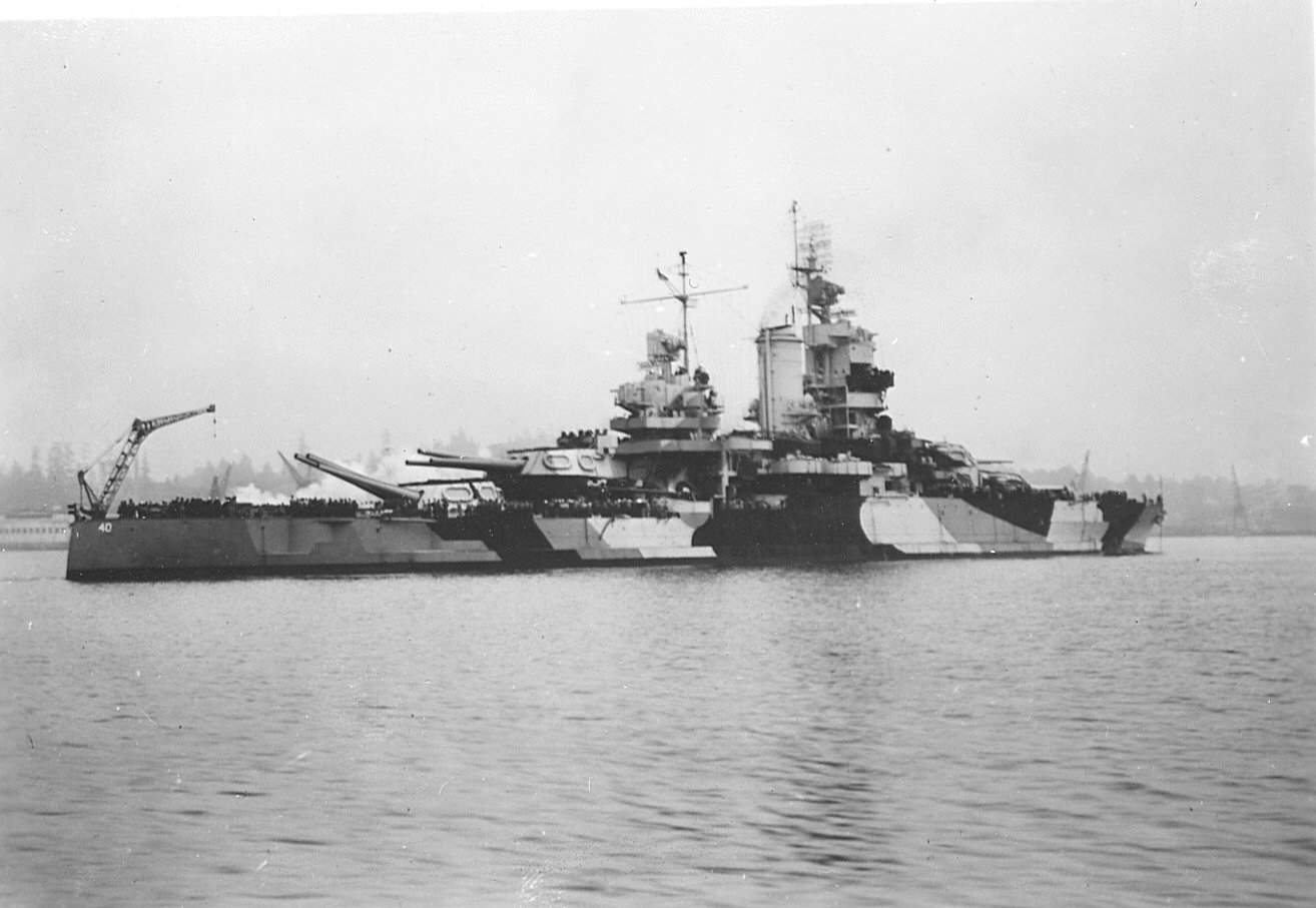 Port side view wearing Camouflage Measure 32, Design 3D on 21 October 1944, Puget Sound Navy Yard showing her final configuration. Ultimate battery of ten quadruple 40mm guns are in place along with 40-45