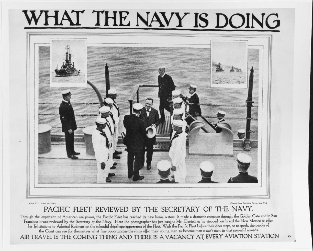 Recruiting Poster: What the Navy is Doing: Pacific Fleet Reviewed by the Secretary of the Navy | Showing Honorable Josephus Daniels, Secretary of the Navy, arriving aboard New Mexico (BB-40) being greeted by Rear Admiral Hugh Rodman. Secretary of the Navy Josephus Daniels Collection, USN photo # NH 76719-KN, courtesy of history.navy.mil. | ![]() 708k |