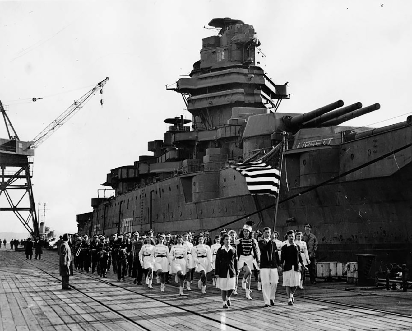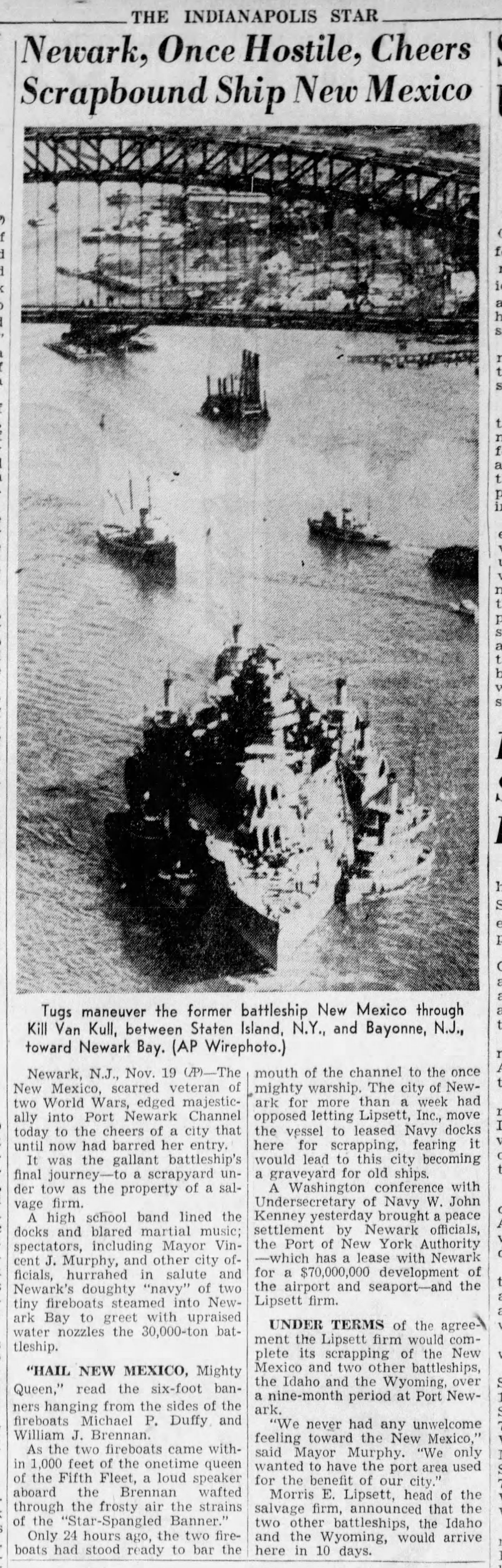 "Battlewagon docks without a battle. | The Eastside High School band of Newark, N. J., welcomes the battleship New Mexico (BB-40) to Newark after her arrival there to be scrapped. The city canceled battle orders to its two fireboats, ready to combat the big ship when she came in, after negotiated peace between port authorities and the Navy. The terms: work must be finished in nine months." Photo courtesy of the George D. McDowell Philadelphia Evening Bulletin Photographs @ digital.library.temple.edu | ![]() 1.76k | New Mexico (BB-40) meets New Jersey. | Indianapolis Star, 20 November 1947, courtesy of Joe MacDonald.