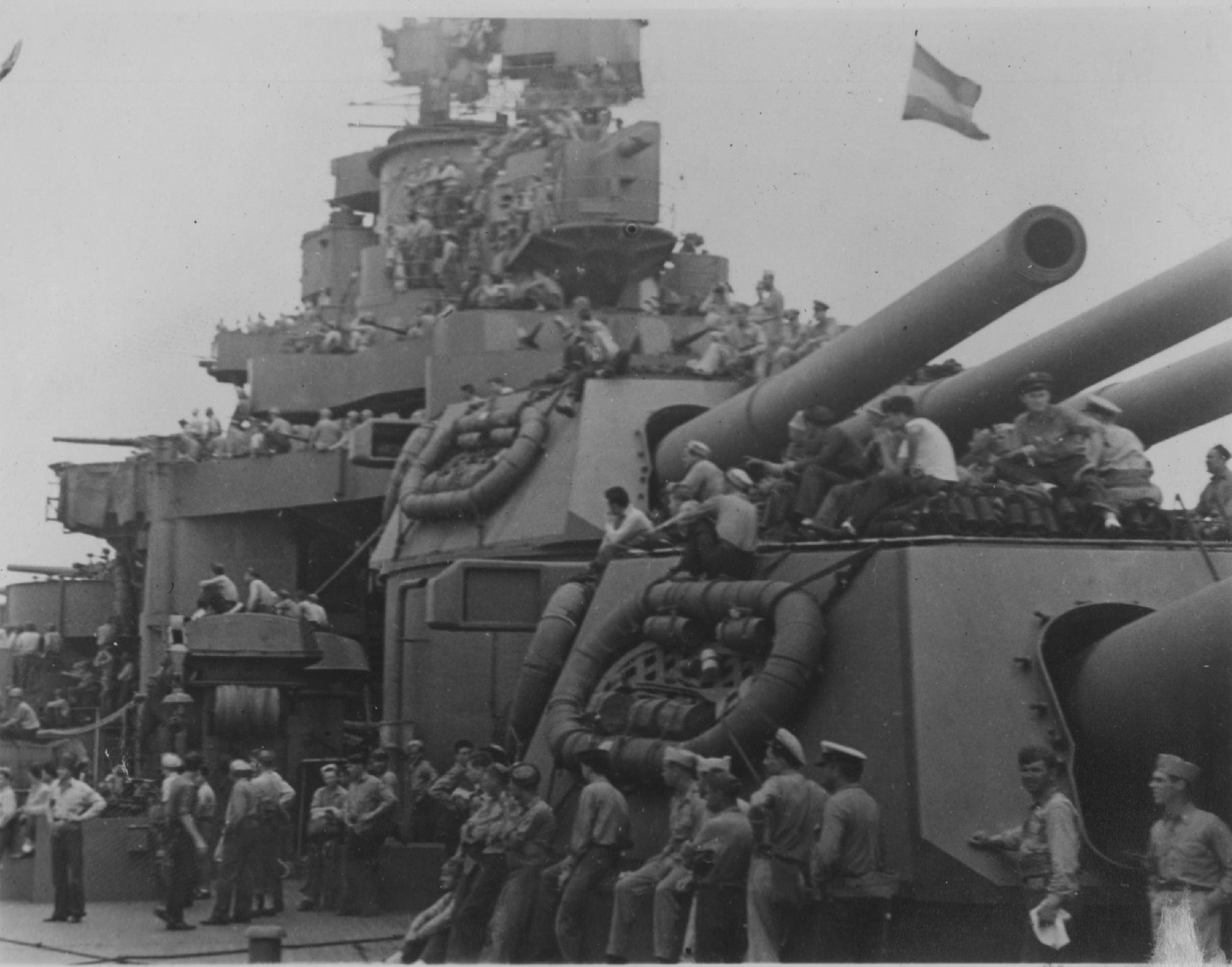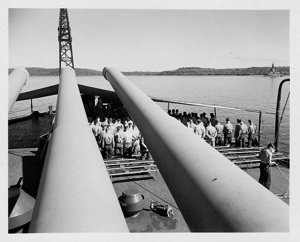 14-inch projectiles on deck, while the battleship was replenishing her ammunition supply prior to the invasion of Guam, July 1944. The photograph looks forward on the starboard side, with 3-gun mount 14"/50 gun turrets at left. Note floater nets stowed atop the turrets. |
