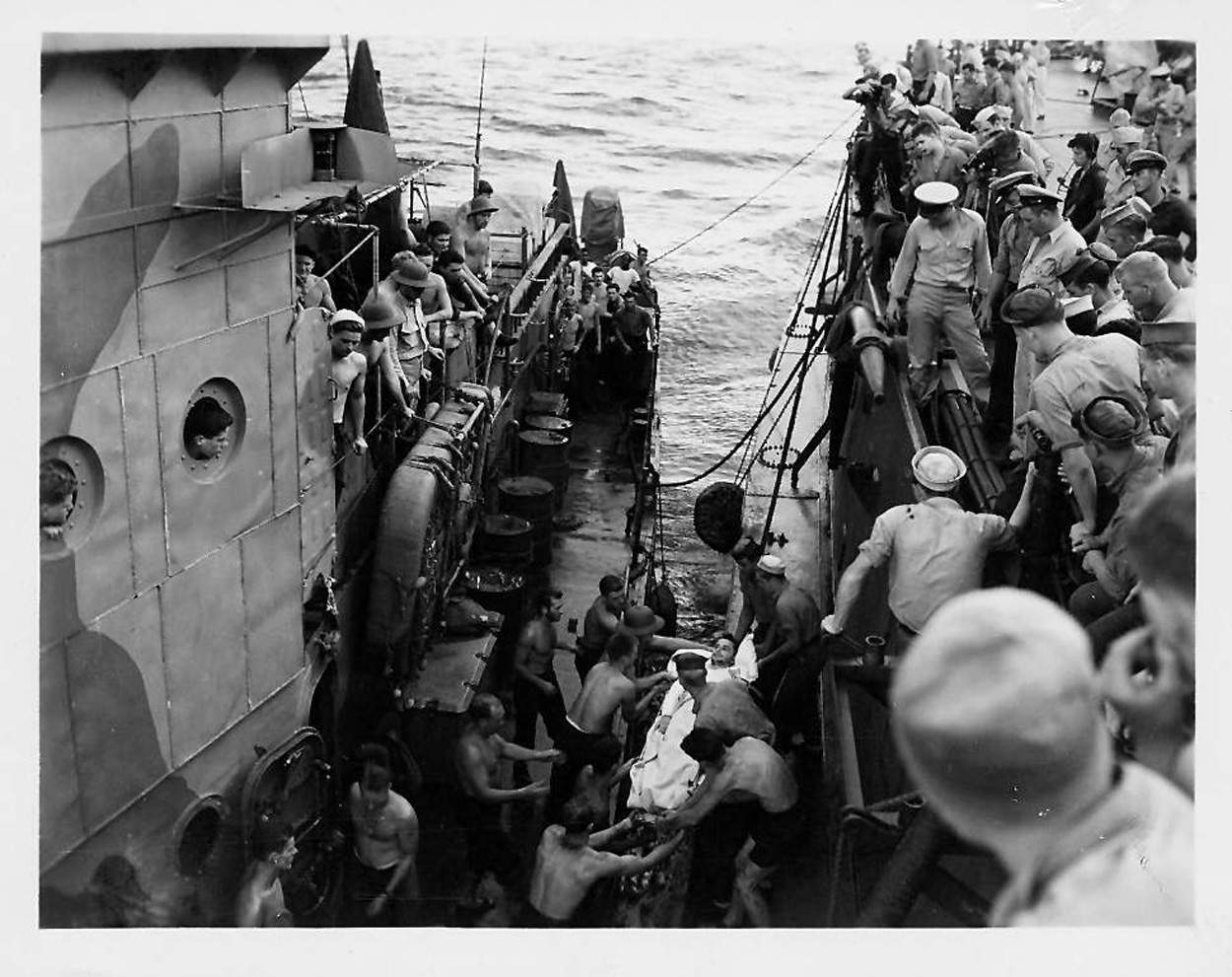 Photo from the collection of Capt. Ellis Zacharias, C.O. from 9/9/ 1943 - 14/9/ 1944, courtesy of Capt. Jerry Zacharias, USN (Ret.) | ![]() 400k |
