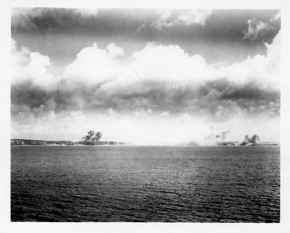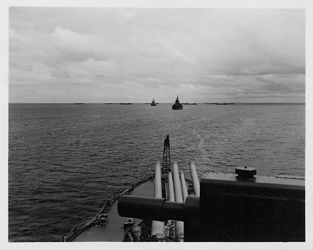 New Mexico (BB-40) firing her after 14"/50 guns during the pre-invasion bombardment of Guam, circa 14-20 July. Taken by a Combat Photo Unit Two (CPU-2) photographer, looking aft along the port side from the forward sky lookout position. |