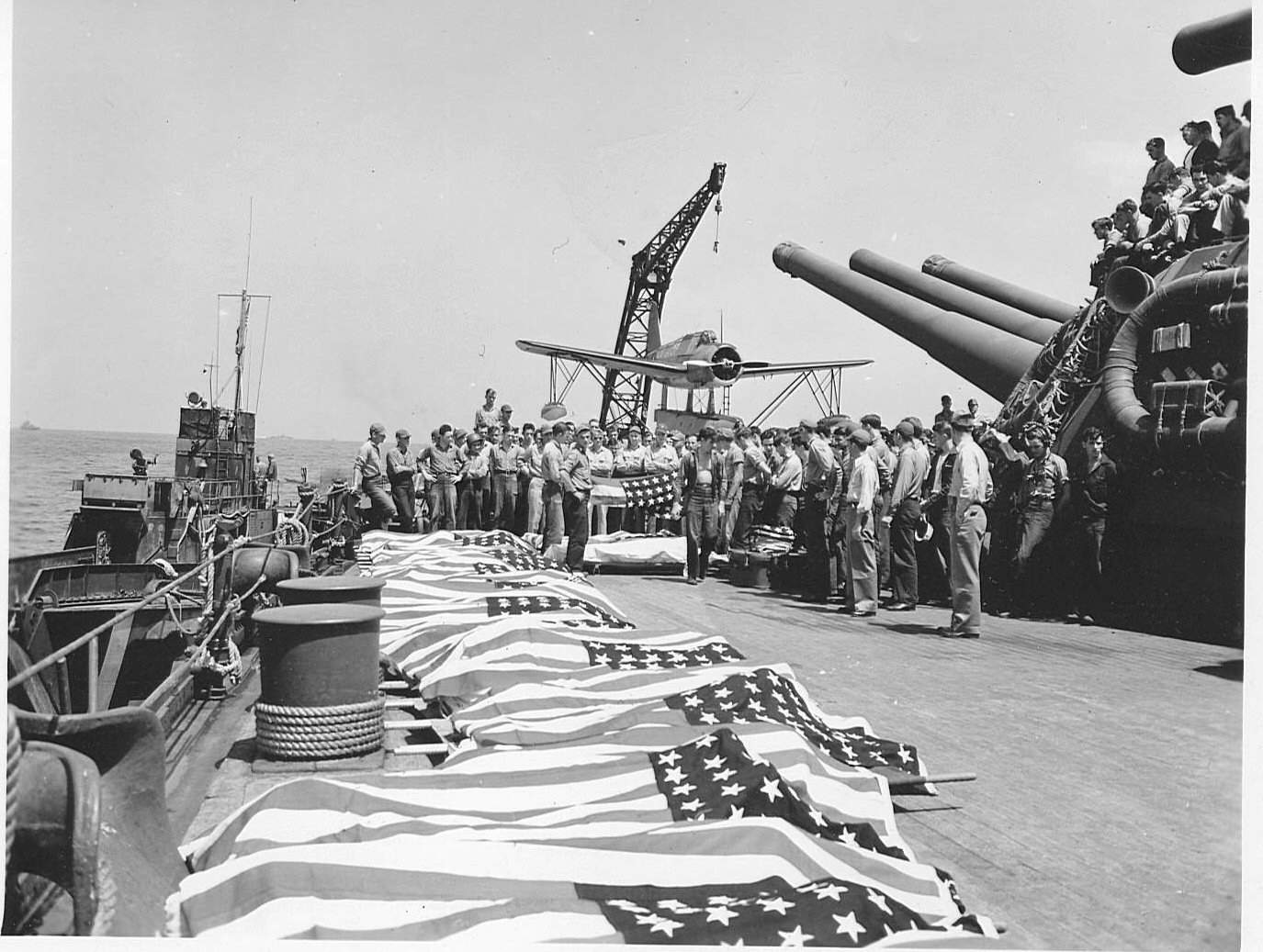 New Mexico (BB-40) probably dated 13 May, the day after a kamikaze hit and a bomb hit killed 54 of her crew, some of who are shown in this photograph under the flags.