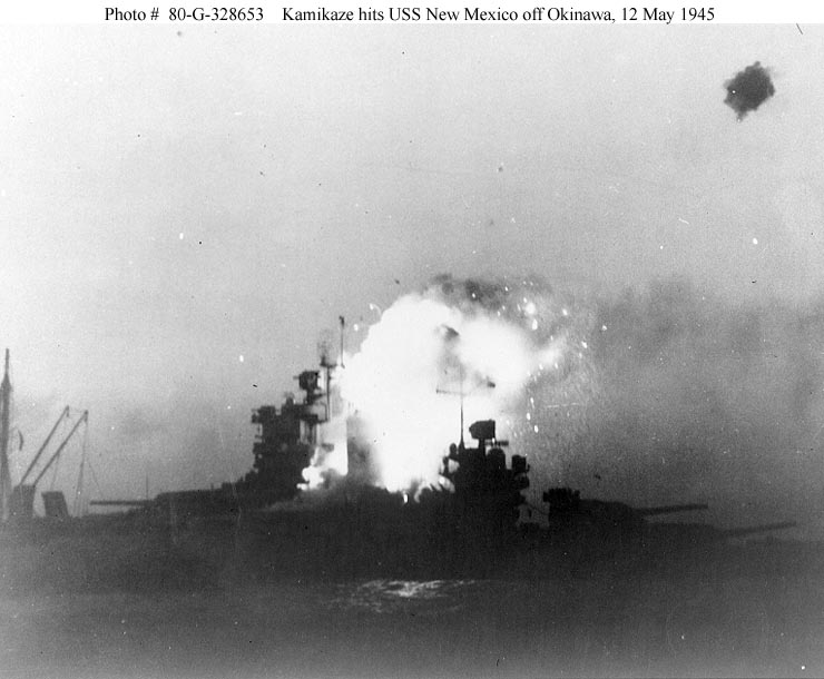 New Mexico (BB-40) is hit by a "Kamikaze" at dusk on 12 May 1945, while off Okinawa. Photographed from Wichita (CA-45). |