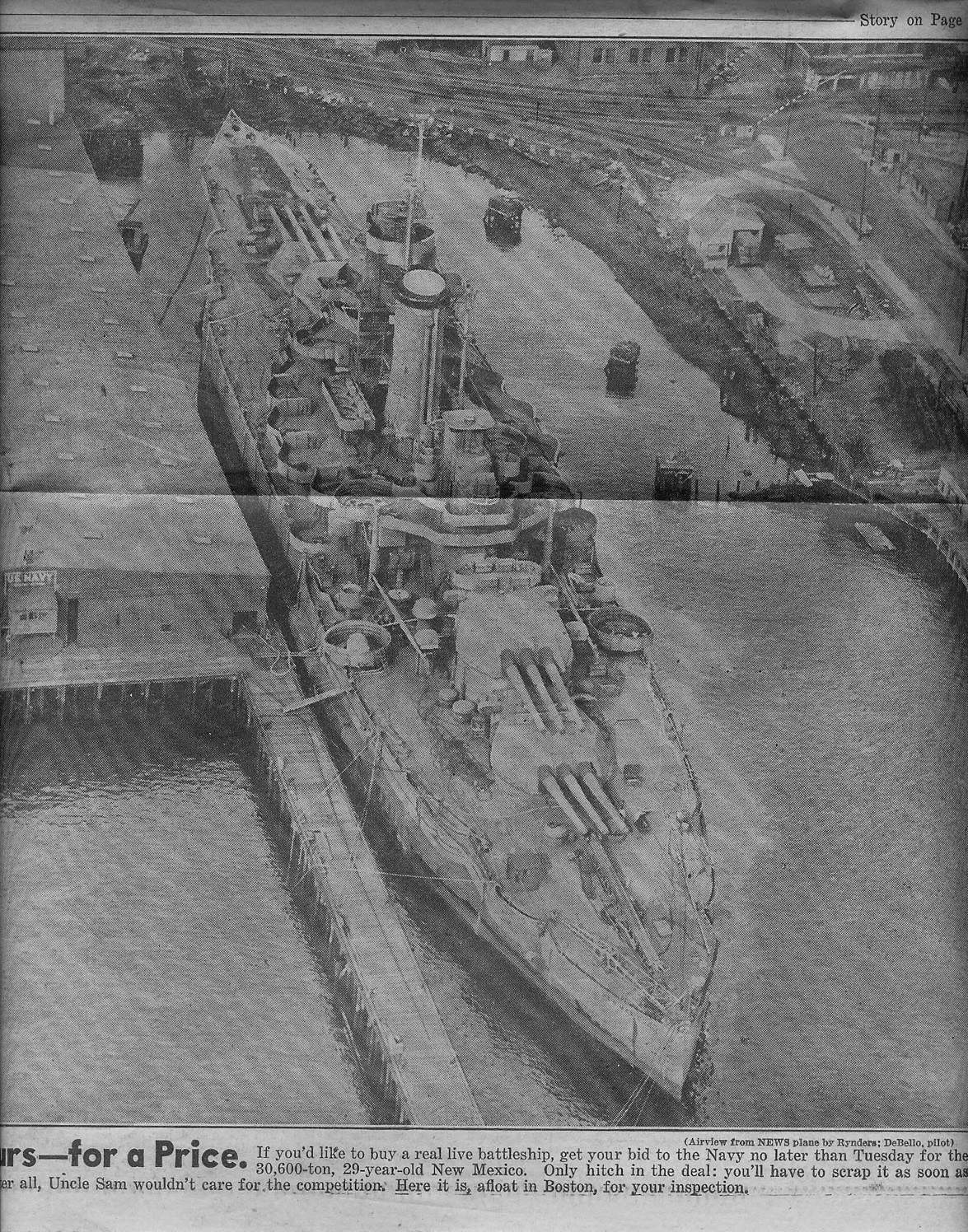"Yours-For a Price" - If you'd like to buy a real live battleship, get your bid to the Navy no later than Tuesday for the 30,600 ton, 29 year old New Mexico (BB-40). Only hitch in the deal; you have to scrap it as soon possible. After all, Uncle Sam wouldn't care for the competition. Here it is, afloat in Boston, for your inspection. |