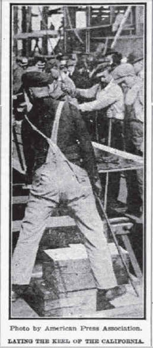 ![]() | 693k | NO OTHER NAVY WILL HAVE SHIP LIKE CALIFORNIA WHEN SHE IS COMPLETED The keel of the Superdreadnought California, destined to be the greatest of battleships, was laid at the navy yard in Brooklyn. The event was an epoch in naval construction, and among those who participated were Secretary of the Navy Daniels, Rear Admiral Nathaniel R. Usher, commandant of the great yard in which the California will be rushed to completion; Rear Admiral Robert S. Griffin, the engineer in chief of the navy, and Rear Admiral David W.Taylor, chief of the bureau of construction in Washington. Her name would be changed before her commissioning to New Mexico (BB-40). | Text i.d. courtesy of Mike Green. Photo by American Press Association. Image and text provided by Ohio Historical Society, Columbus, OH. & University of Utah, Marriott Library. Photo from The Democratic Banner. (Mt. Vernon, Ohio) 1898-192?, 19 October 1915, Image 1 & The Broad Ax.(Salt Lake City, Utah) 1895-19??, 30 October 1915, Image 2, courtesy of chroniclingamerica.loc.gov. | ||||||||||||||||||||||||||||||||||||||||||||||||||||||||||||||||||||||||||||||||||||||||||||||||||||||||||||||||||||||||||||||||||||||||||||||||||||||||||||||||||||||||||||||||||||||||||||||||||||||||||||||||||||||||||||||||||||||||||||||||||||||||||||||||||||||||||||||||||||||||||||||||||||||||||||||||||||||||||||||||||||||||||||||||||||||||||||||||||||||||||||||||||||||||||||||||||||||||||||||||||||||||||||||||||||||||||||||||||||||||||||||||||||||||||||||||||||||||||||||||||||||||||||||||||||||||||||||||||||||||||||||||||||||||||||||||||||||||||||||||||||||||||||||||||||||||||||||||||||||||||||||||||||||||||||||||||||||||||||||||||||||||||||||||||||||||||||||||||||||||||||||||||||||||||||||||||||||||||||||||||||||||||||||||||||||||||||||||||||||||||||||||||||||||||||||||||||||||||||||||||||||||||||||||||||||||||||||||||||||||||||||||||||||||||||||||||||||||||||||||||||||||||||||||||||||||||||||||||||||||||||||||||||||||||||||||||||||||||||||||||||||||||||||||||||||||||||||||||||