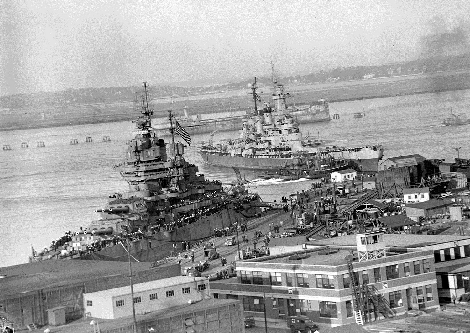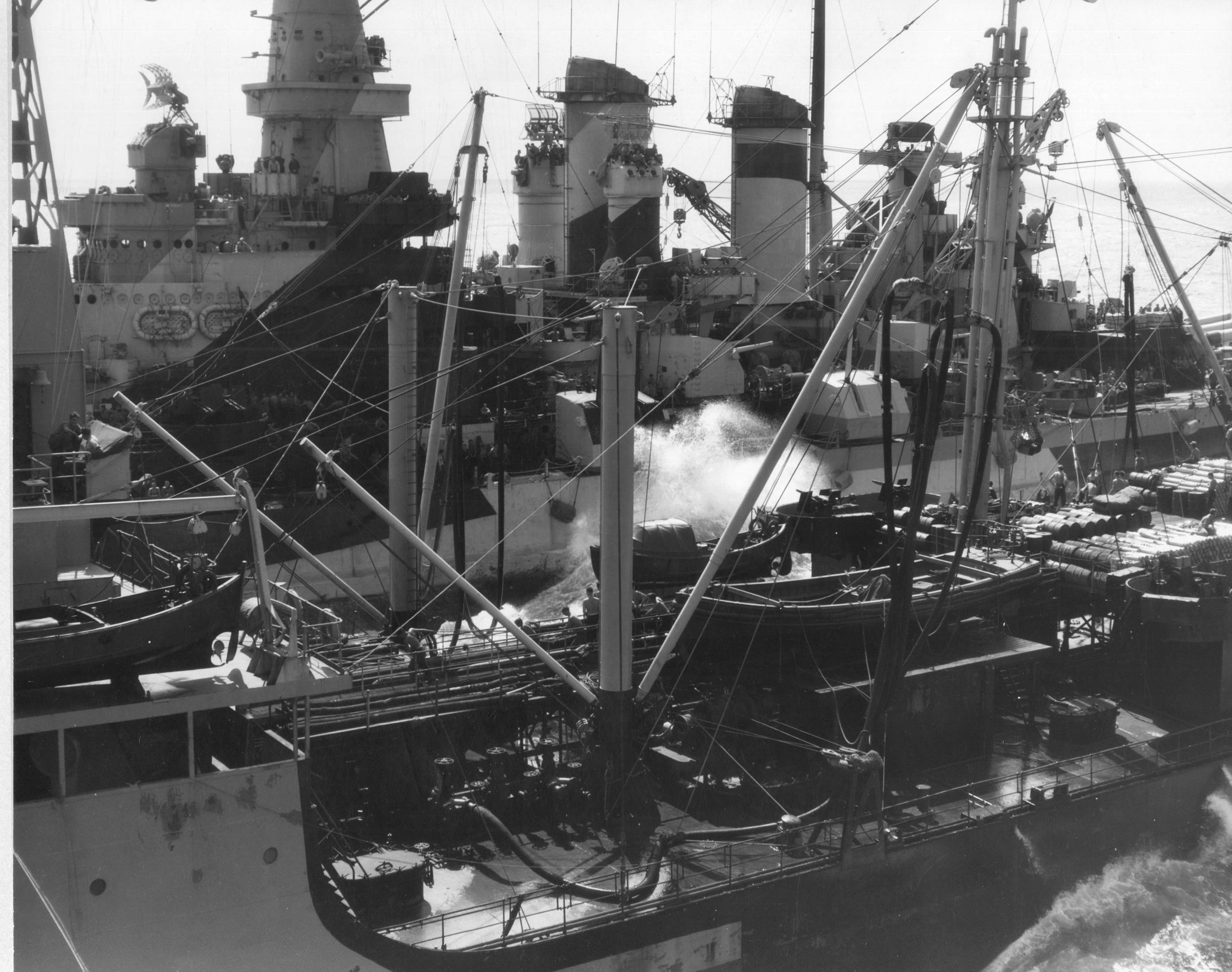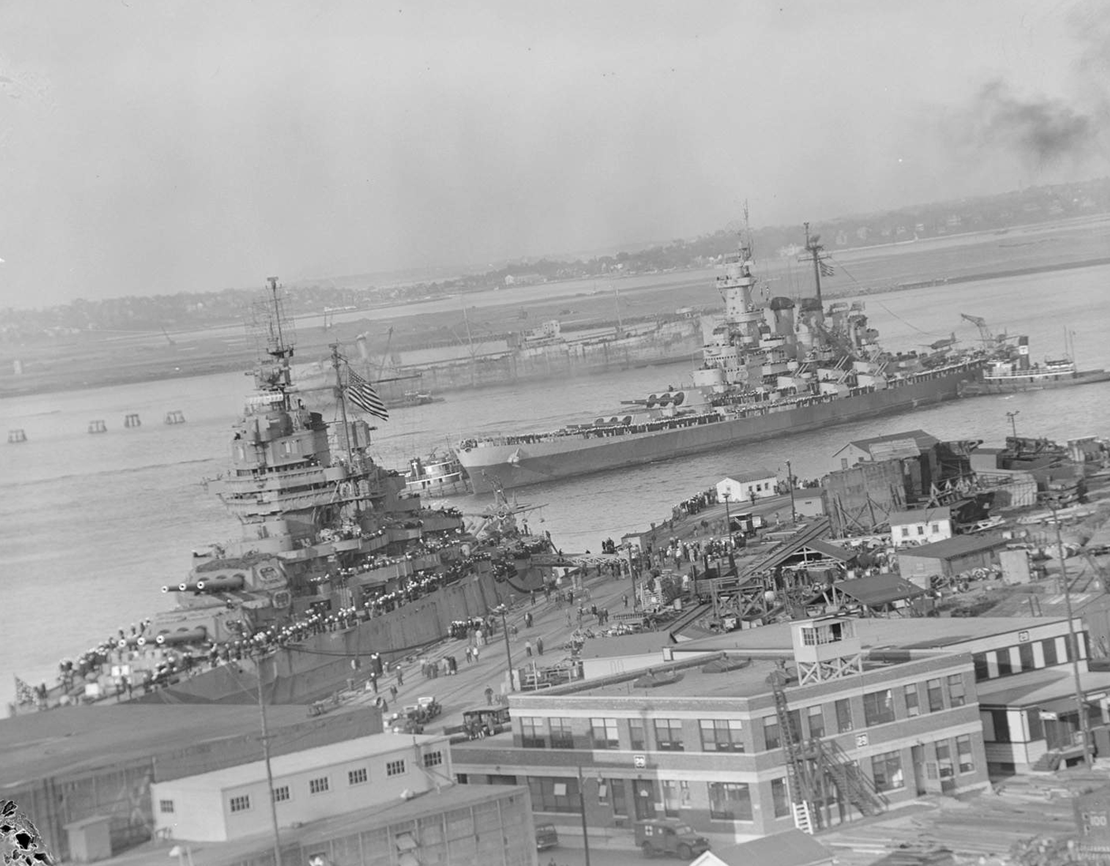 1.09k | Battleship New Mexico (BB-40) being brought into Boston Navy Yard on 17 October 1945. The North Carolina (BB-55) anchored there also, and after overhaul at New York exercised in New England waters and carried Naval Academy midshipmen for a summer training cruise in the Caribbean. | Partial text courtesy of DANFS. Photo 08_06_022495 courtesy of the Boston Public Library, Leslie Jones Collection via Sean Hert & Mike Green via flickr.com. | |