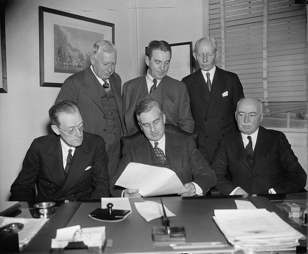 ![]() | 145k | New battleship design board. Washington, D.C., 8 October 1937. A special advisory board on battleship plans, which was recently named by Secretary of the Navy Swanson, held their initial meeting at the Navy Department today. The board will be charged with obtaining for the Navy Department the advice of outstanding experts in the principal fields of Naval construction to use in completing the designs of the two new battleships of the North Carolina class (BB-55 / 56) In the photograph, left to right, (sitting): W.F. Gibbs, President of Gibbs and Cox, Inc.; Assistant Secretary of the Navy Charles Edison; and Admiral Joseph Strauss, U.S.N. Standing, left to right: John F. Metton, President, N.Y. Shipbuilding Corp.; Joseph W. Powell, United Shipyards Inc.; and Professor William Hovgaard, Massachusetts Institute of Technology. | Photo # LC-DIG-hec-23466 photo & text courtesy of the Harris & Ewing Collection. | |