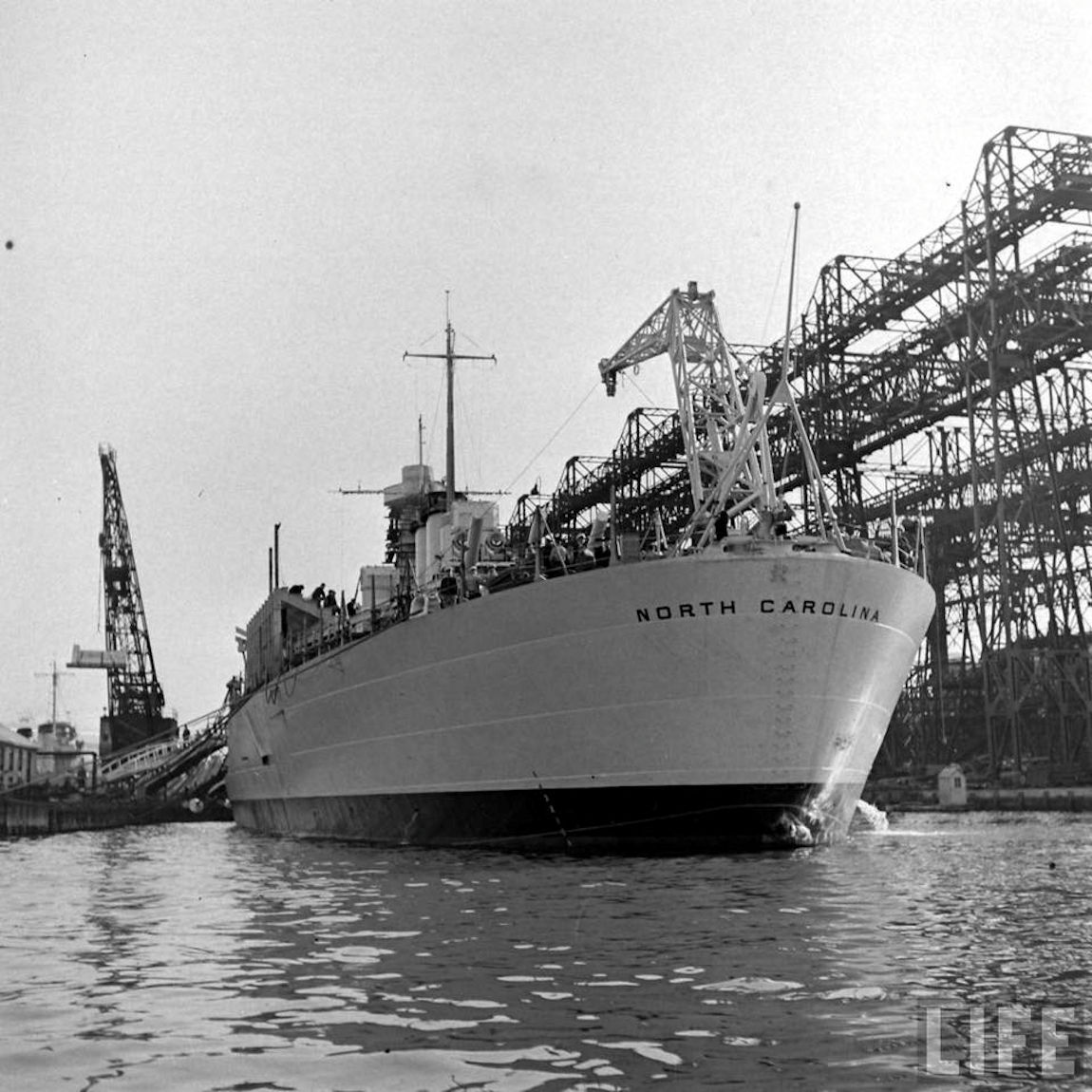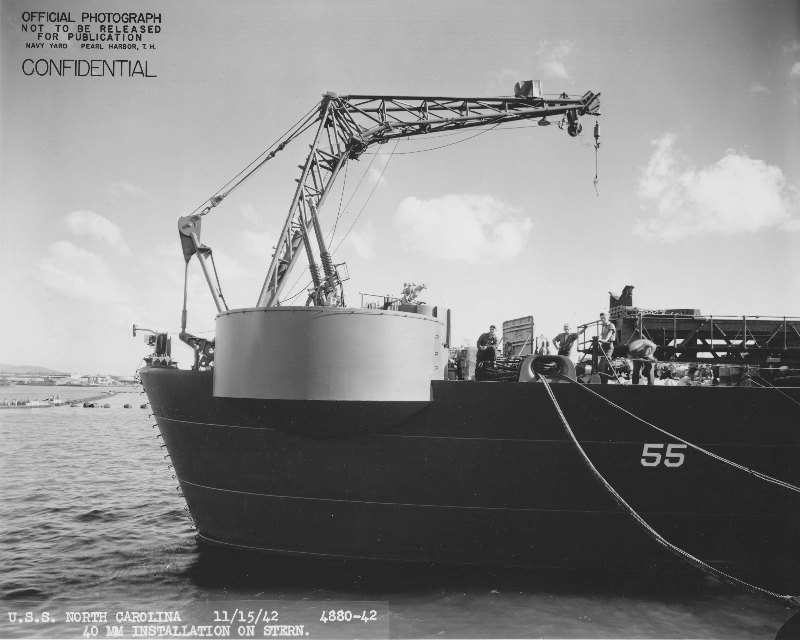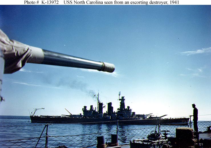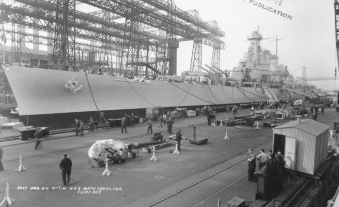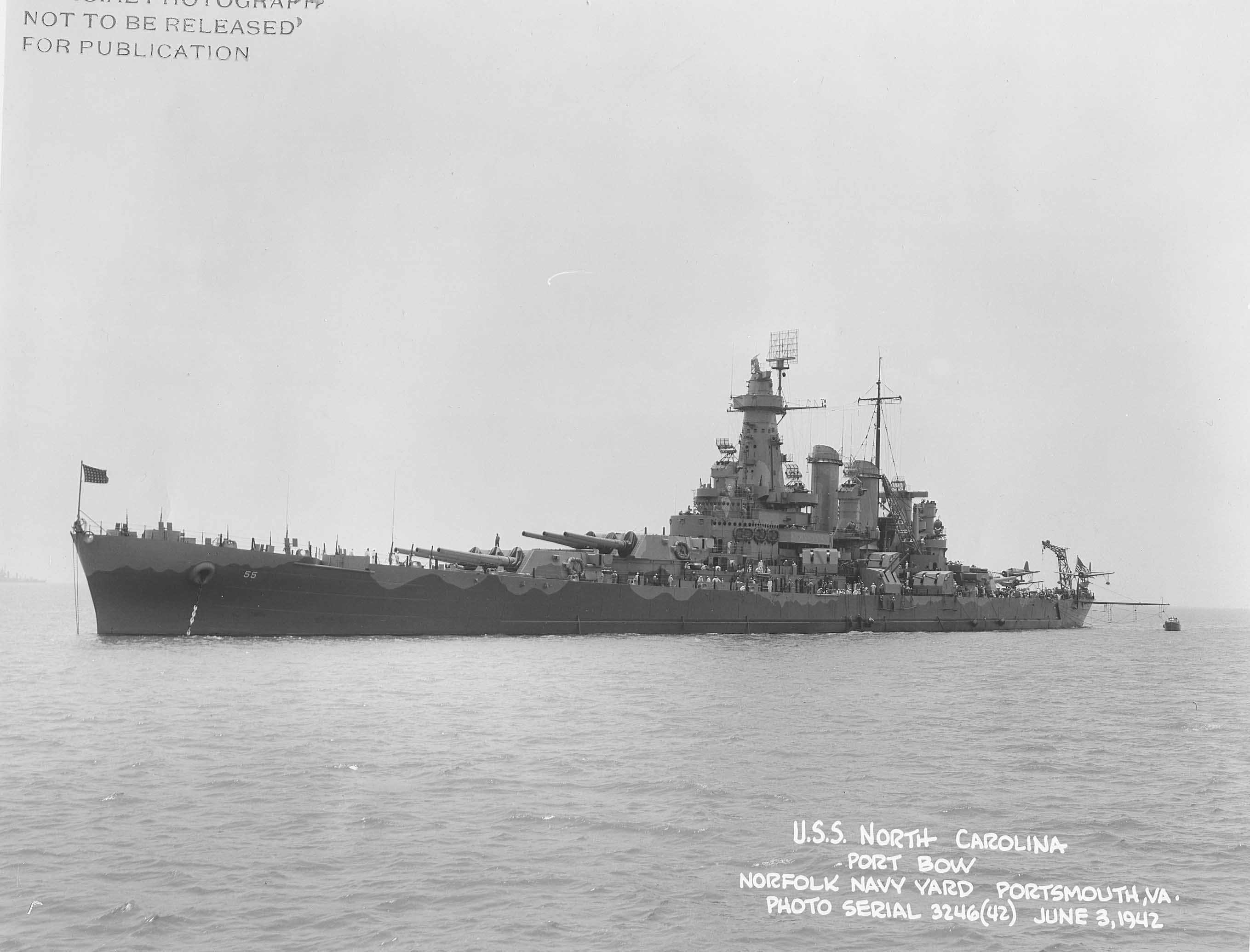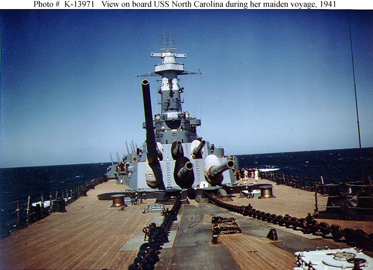 ![]() | 734k | Bow on view of North Carolina (BB-55) fitting out at the New York Navy Yard circa March-April 1941, about the time she was commissioned. | Source: Naval History and Heritage Command, Photo No. NH 44715 via Mike Green. | |