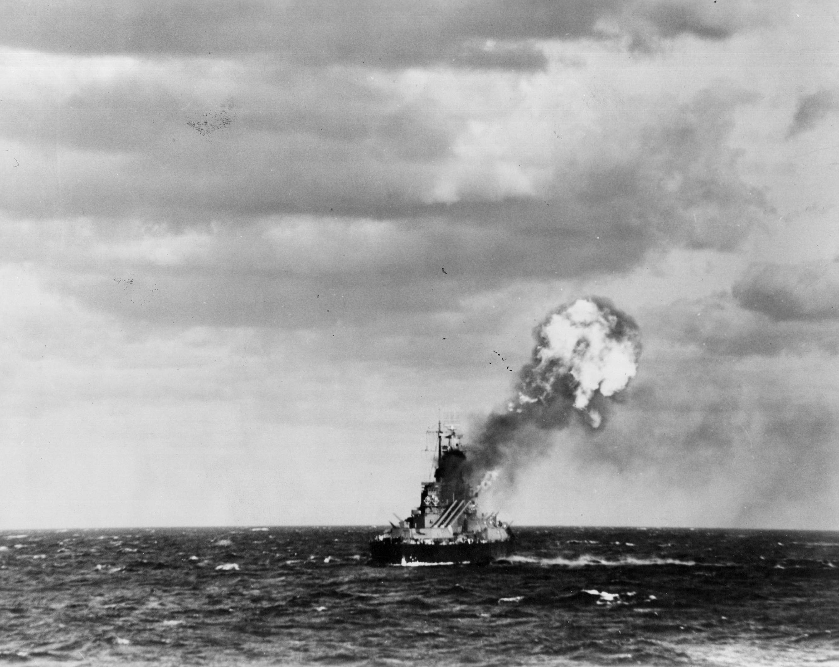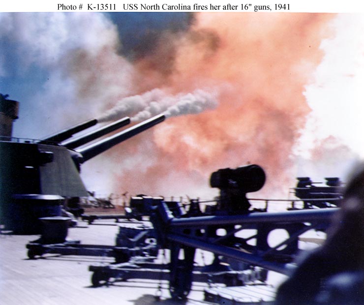 404k | North Carolina (BB-55) firing a salvo with main battery of 16" guns. | USN photo # 80-G-19087 from National Archives and Records Administration (NARA), College Park, Maryland, courtesy of Sean Hert. | |