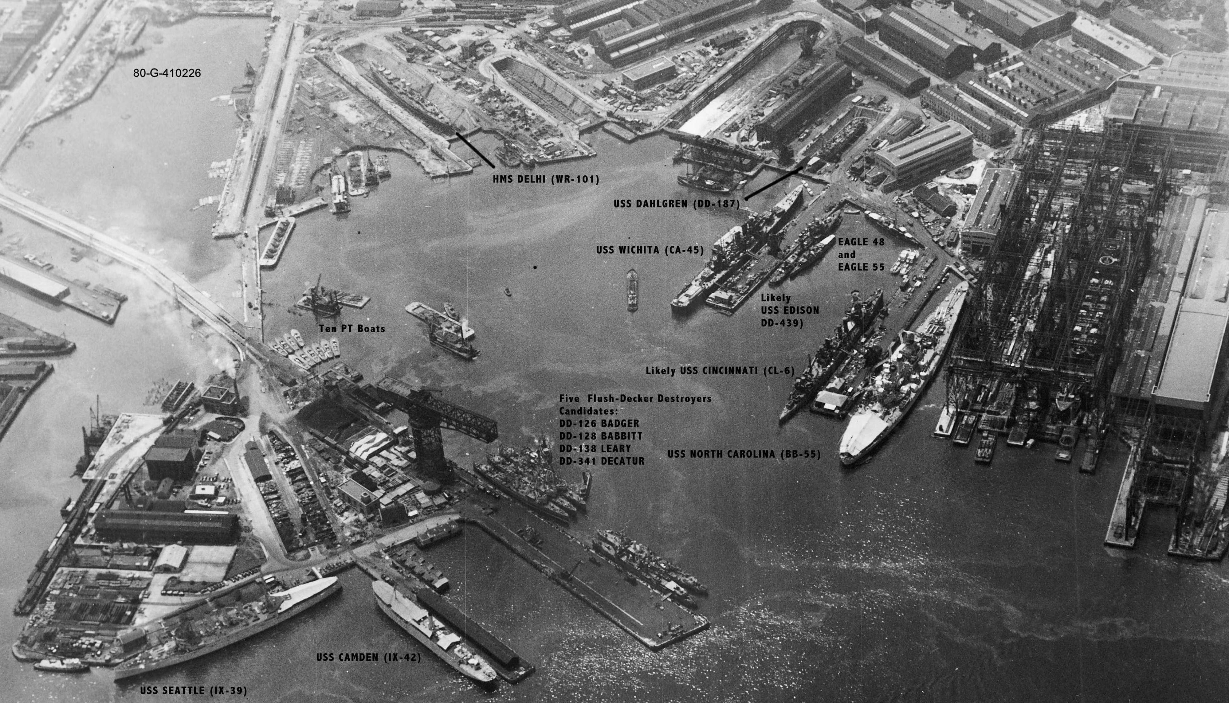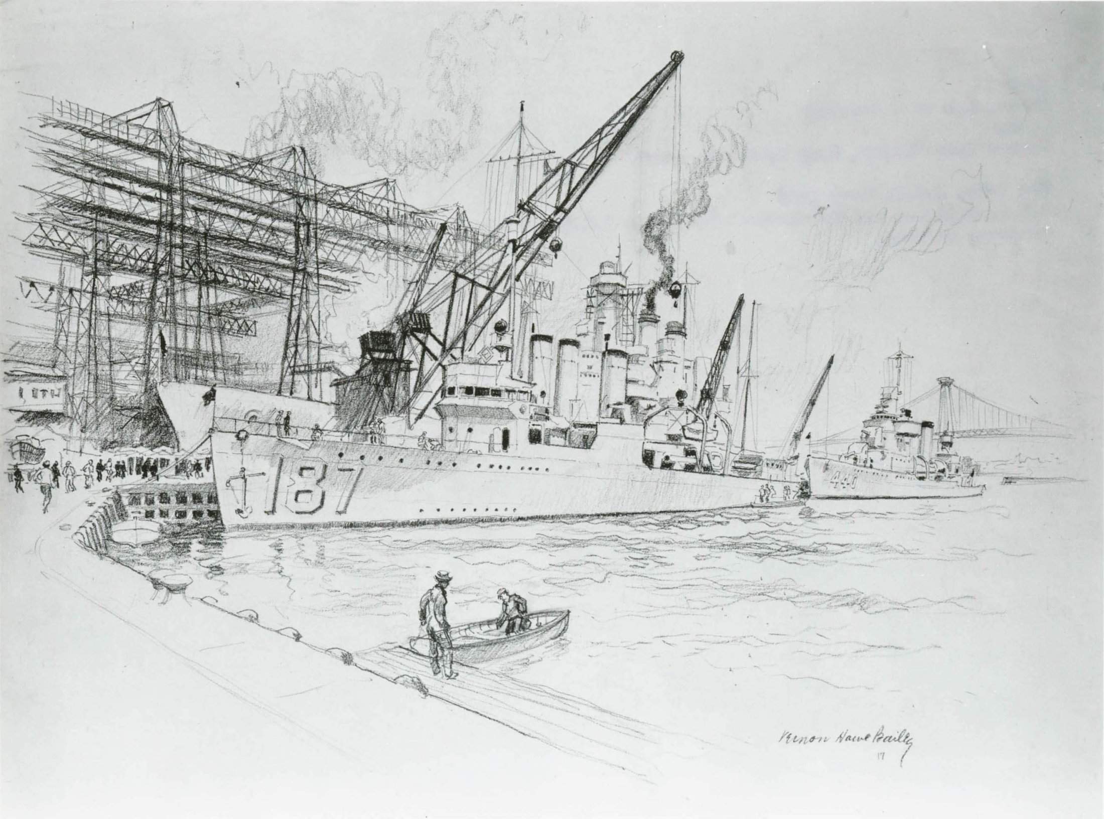 ![]() | 444k | This original 1941 artwork by Navy artist Vernon Howe Bailey is titled "USS Dahlgren & Ericsson at Pier" and is set at the former New York Navy Yard. Pictured are Dahlgren (DD-187) and Ericsson (DD-440) with the then brand new North Carolina (BB-55) in the background. | USN photo # N-0000B-001, courtesy of the Naval History and Heritage Command / news.navy.mil. | |