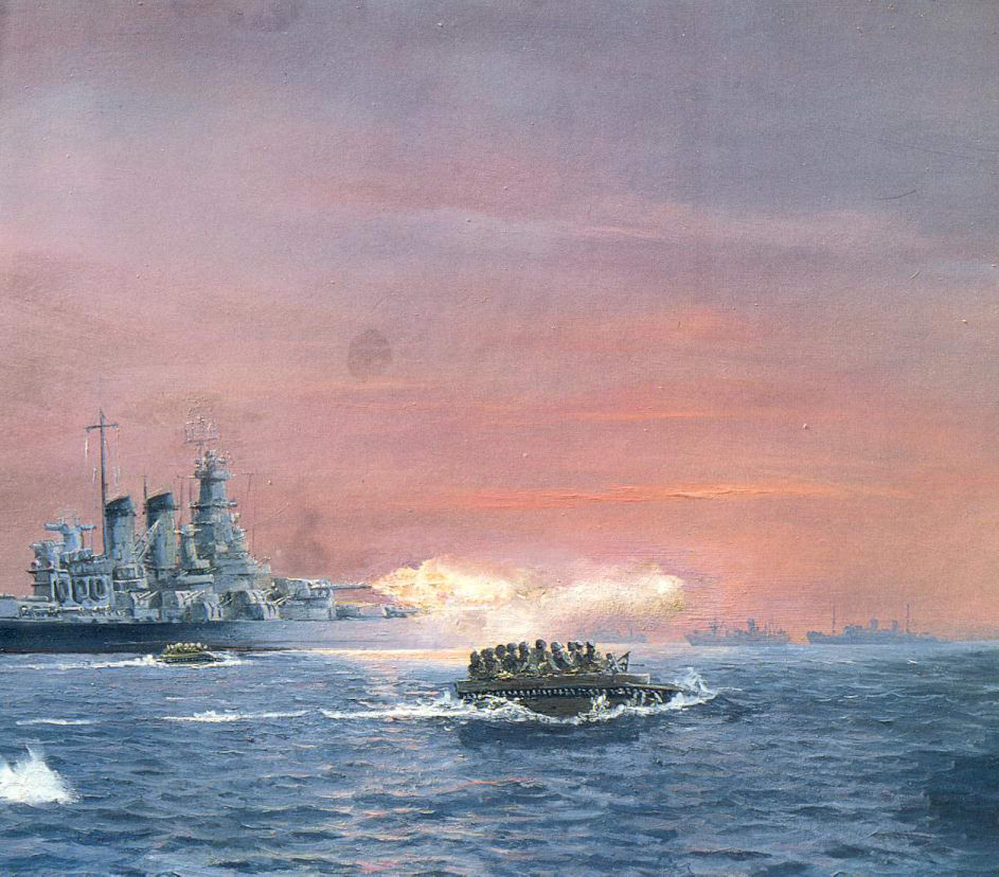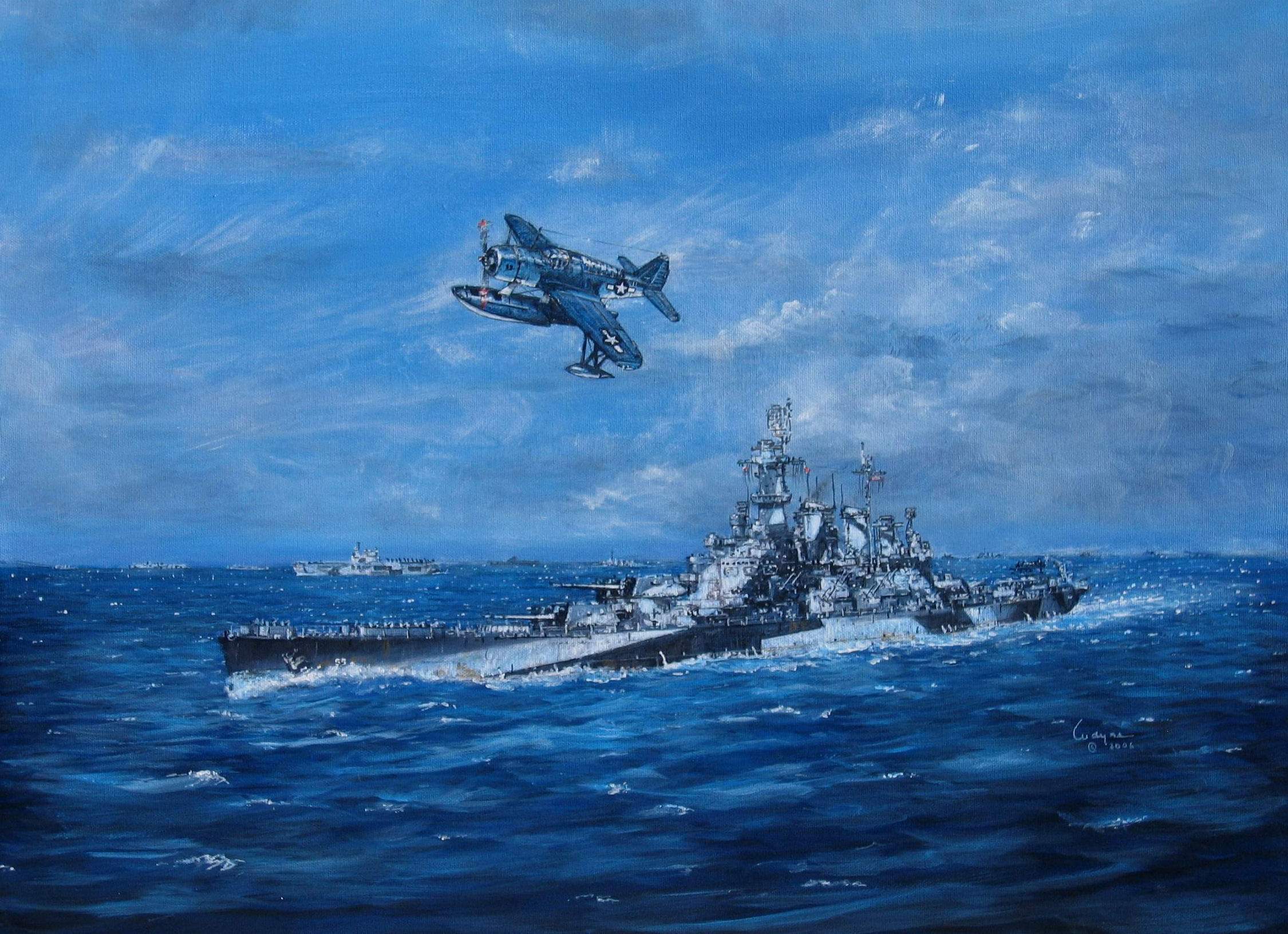 ![]() | 77k | Oil on canvas painting by the artist Anthony Saunders entitled "North Carolina, Saipan Bound." By June 1944 the US Fleet had made a huge leap across the Pacific to the Mariana's, a small group of Japanese held islands of which Saipan would prove the most difficult to overcome. The landing were supported by the US 5th Fleet, which included North Carolina (BB-55) together with an increasingly powerful armada of battle hardened warships. The destroyer La Vallette (DD-448) is alongside. | Text and drawing courtesy of naval-art.com | |