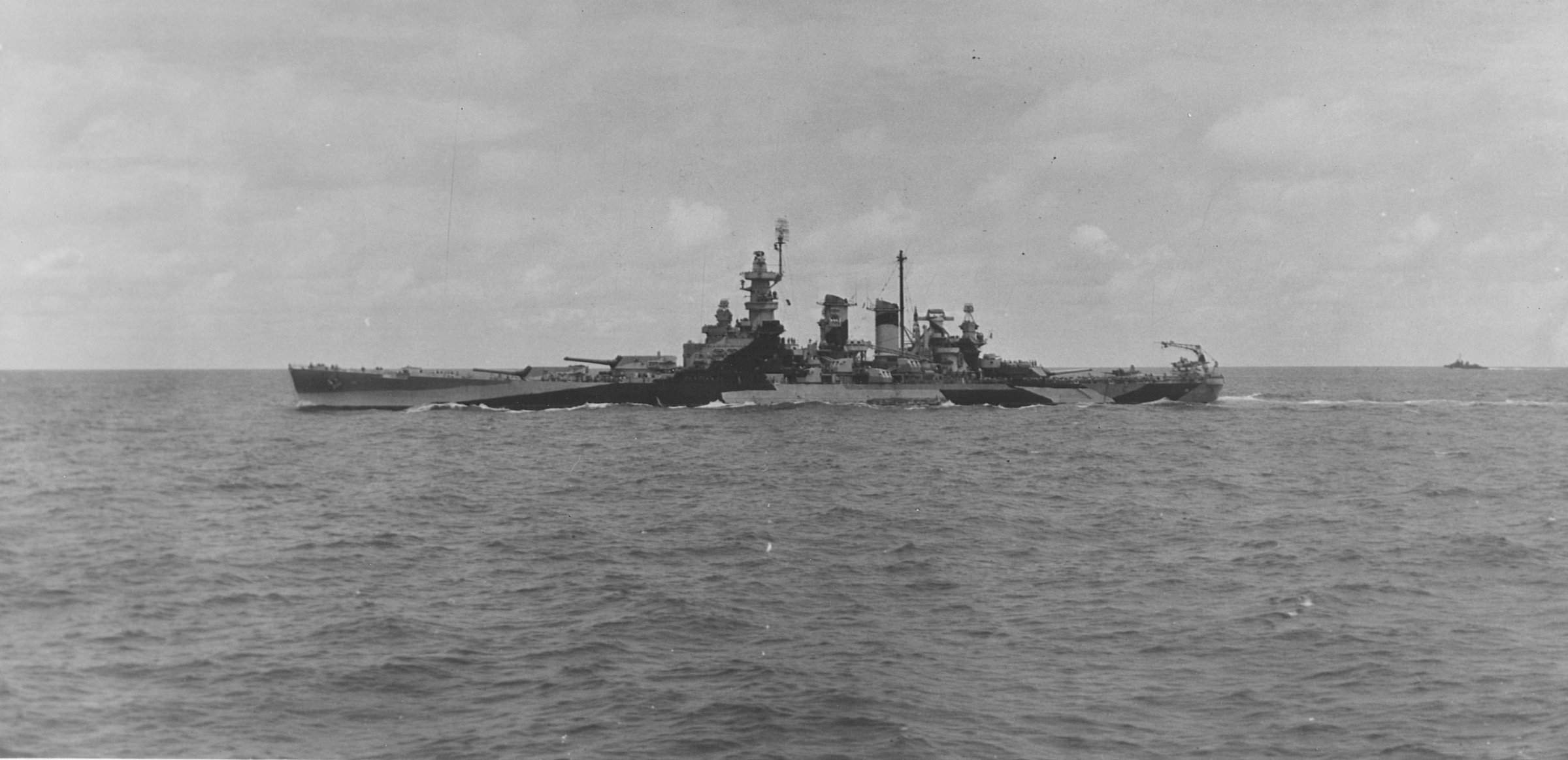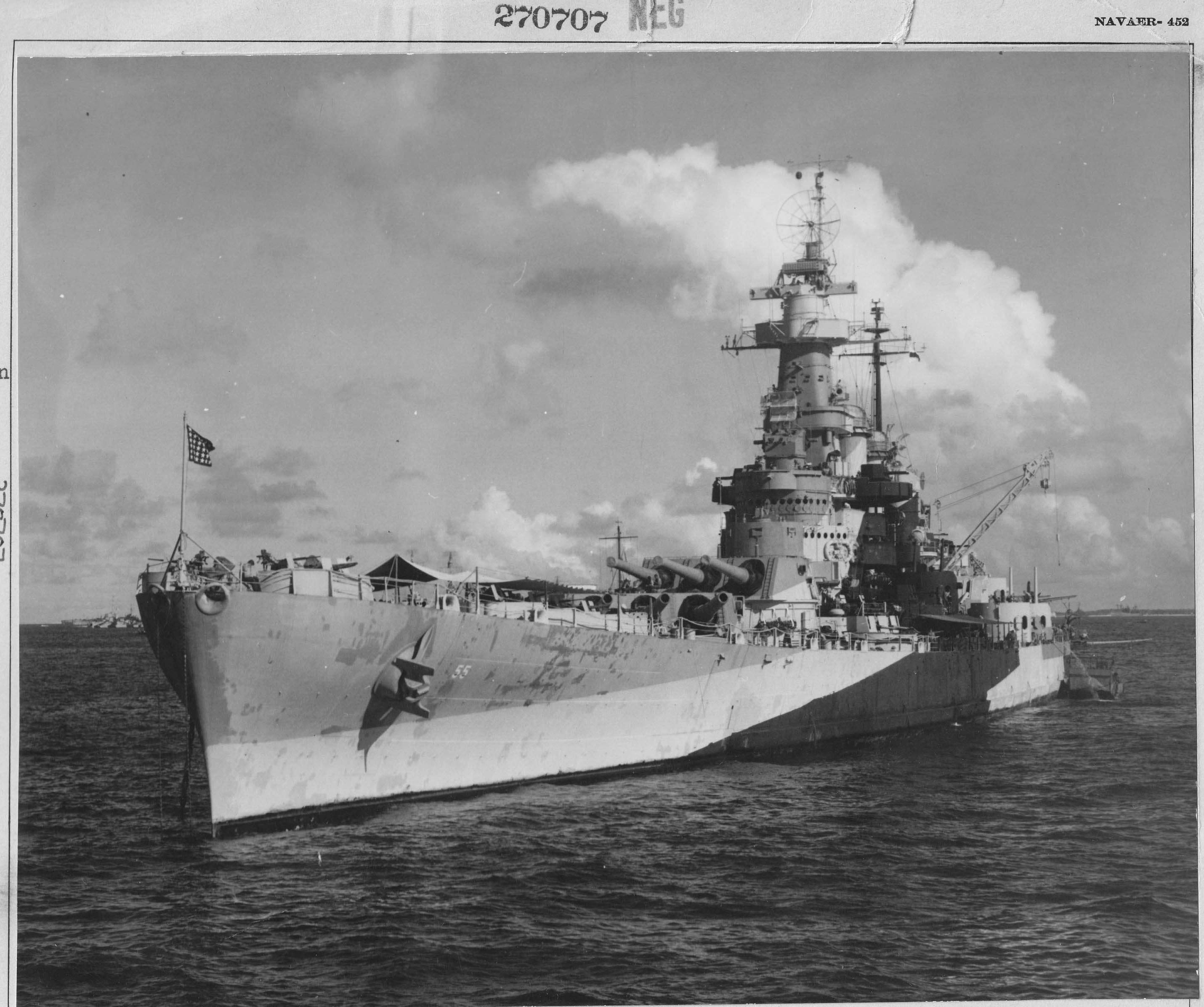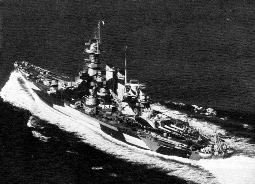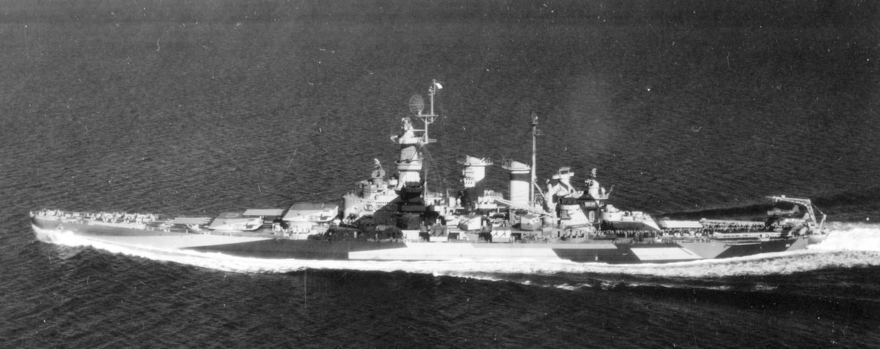88k | Battleships of the U.S Pacific Fleet following Ticonderoga (CV-14) [out of photo ahead of the Washington (BB-56)] entering Ulithi Atoll on 12 December 1944. Washington, North Carolina (BB-55), and South Dakota (BB-57) are in line ahead formation. Note that three camouflage schemes are shown; MS22 (Washington ), MS32/18d (North Carolina ) and MS21 (South Dakota ). | None of these can be 12 December. These ships (TG 38.3) departed Ulithi on 11 December. This TG entered Ulithi together on 2 and 24 December. These are likely 24 December 1944 when they're conducting numerous maneuvers and firing exercises while entering Ulithi. Slight chance 2 December but if Oakland (CL-95) is in the picture, she didn't enter with the others on 2 December. One thing for certain, these are not the 11th like the caption on NHHC states. Many open discussions on forums discussing the merits of both dates. Text & ID courtesy of Richard Averitt. Naval Historical Photo # 80-G-301950 submitted by Mike Green. |
