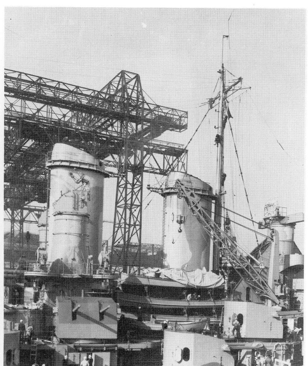 ![]() | 365k | Boat handling crane, port side with nested boats between the stacks. Note searchlight at base of forward stack. | USN photo courtesy of Pieter Bakels. | |