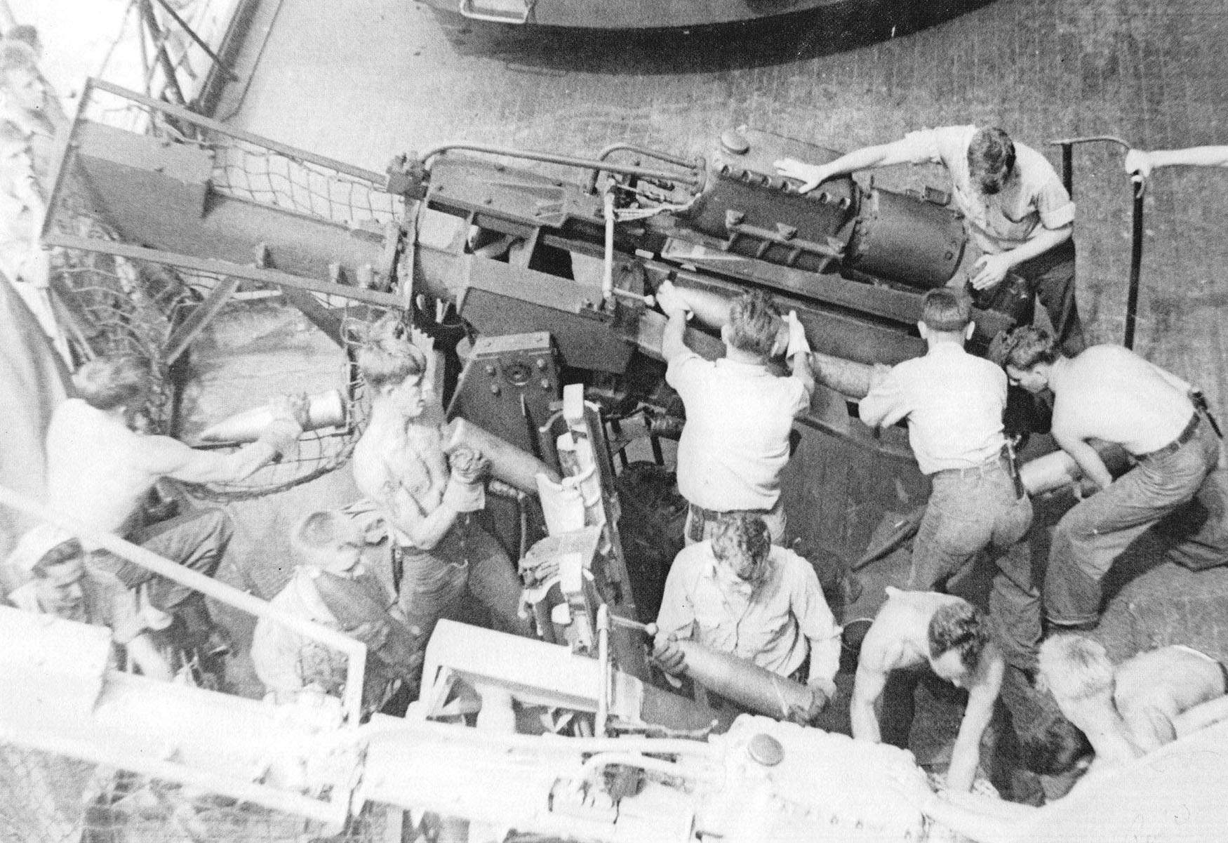 ![]() | 343k | Loading drill for a 5-Inch Crew aboard North Carolina (BB-55) was on a daily basis. | USN photo courtesy of Pieter Bakels. | |