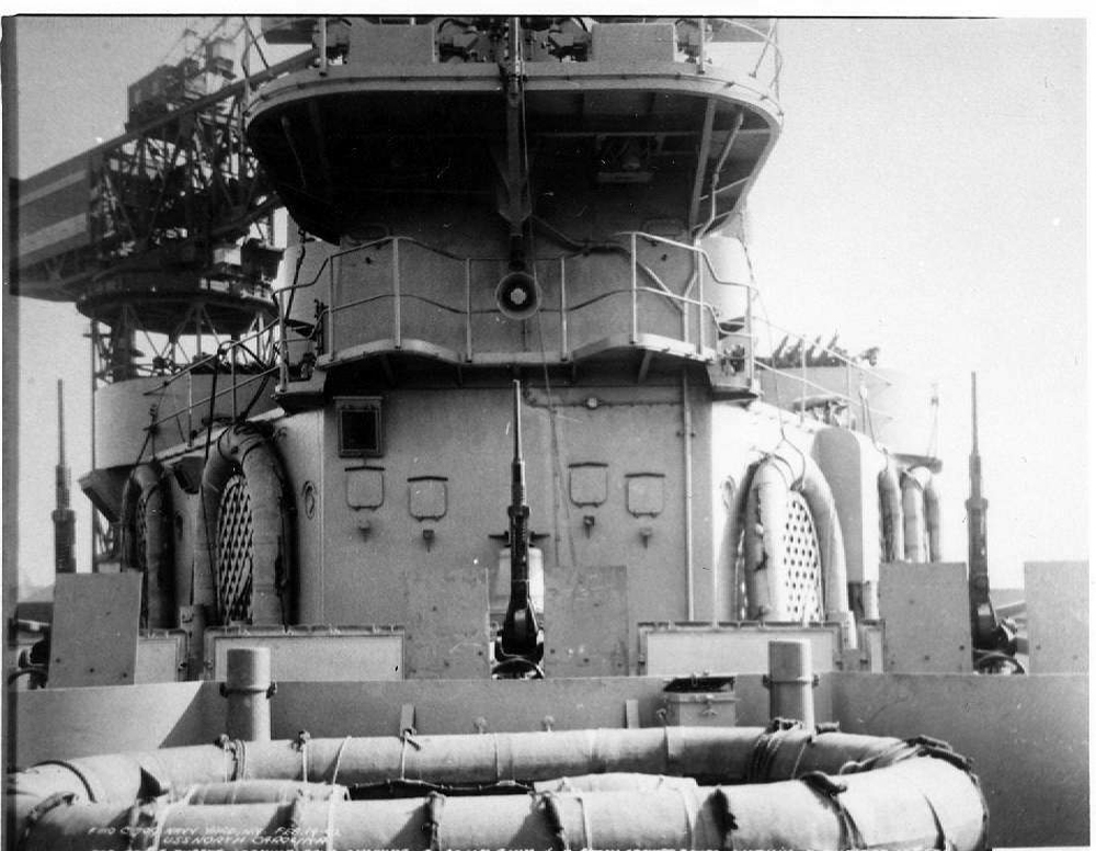 ![]() | 325k | Port side view of bridge structure with a twin 5-Inch mount at lower right. Note radar antennas. | USN photo courtesy of Pieter Bakels. | |
