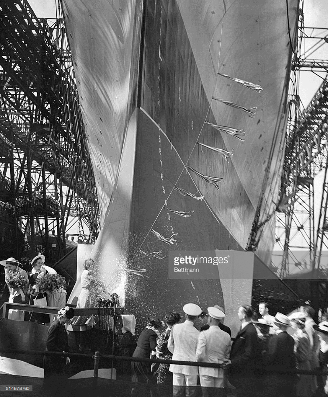 ![]() | 974k | (Original Caption) 6/13/1940- New York, NY: New battleship christened. Miss Isabel Hoey, daughter of the governor of North Carolina, christening the 35,000 ton battleship North Carolina (BB-55) during launching ceremonies at New York Navy Yard, June 13. It was the first battleship laid down for the U.S. Navy since the Washington Naval Conference of 1921. This shot is a wide shot of the bow of the boat, the woman with the bottle spraying, and the Naval audience. | Photo by Bettmann/Getty Images, courtesy of gettyimages.com. | |