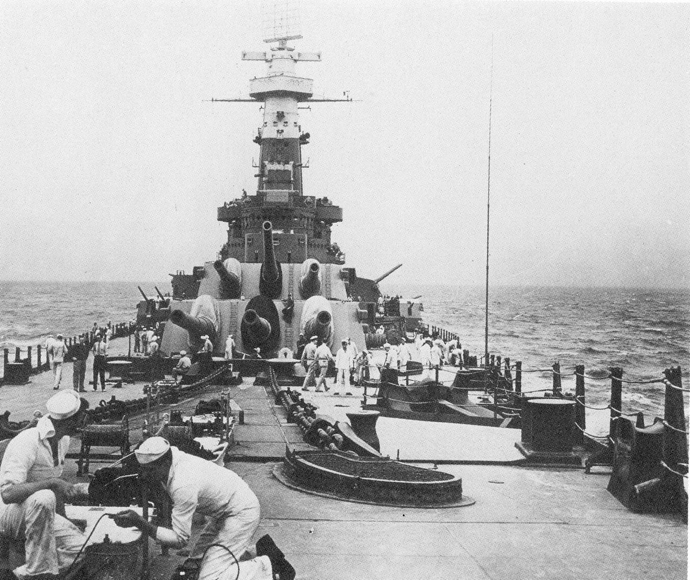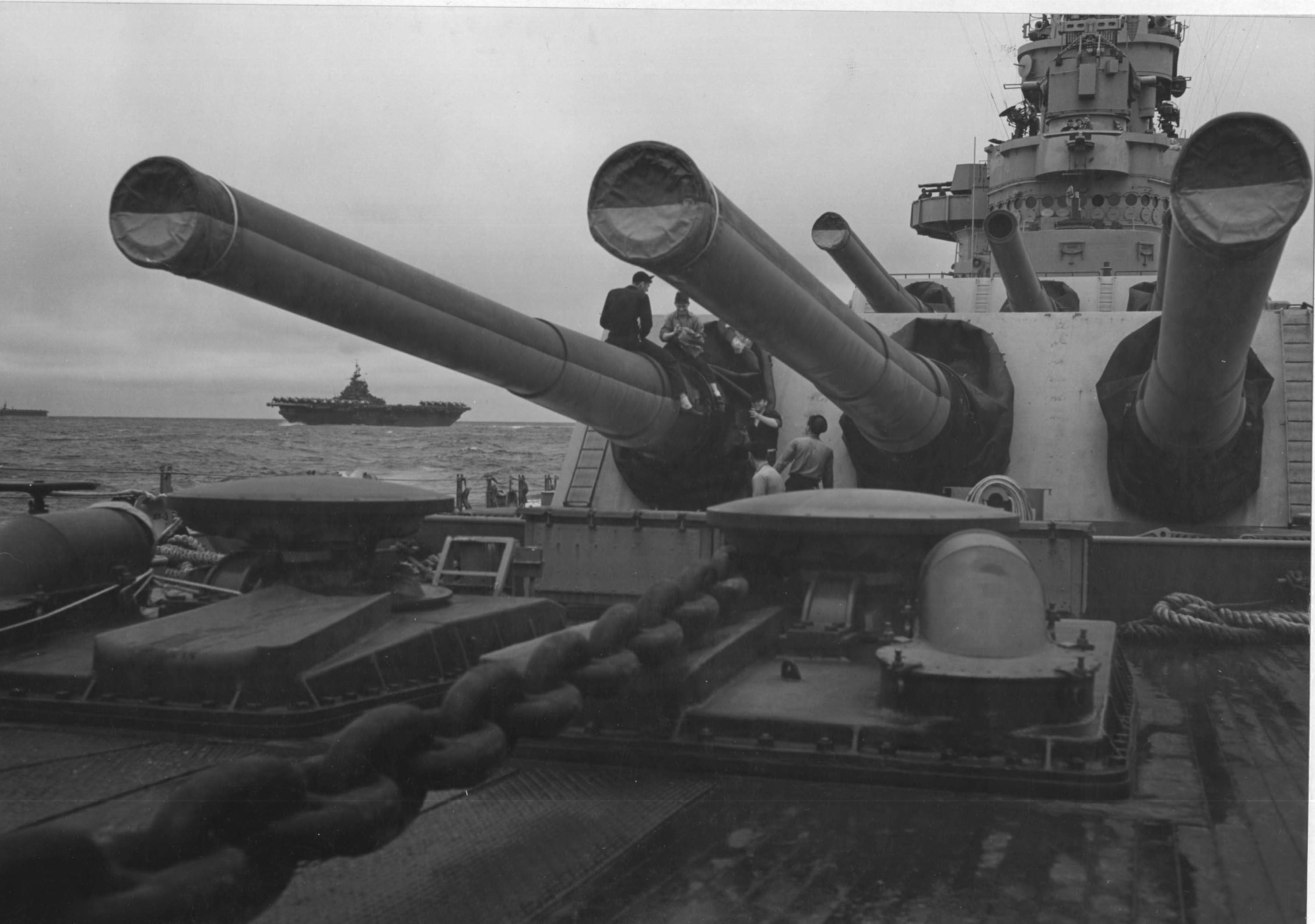 ![]() | 91k | View looking aft from the battleship's bow, showing her forward superstructure and 16"/45 guns. Photographed during her military trials 22-31 August 1941. Note Measure 12 camouflage paint, CXAM-1 radar antenna, anchor chains and deck planking. | Official USN photo Naval History and Heritage Command # 80-G-K-13971, from the collections of the Naval Historical Center. | |