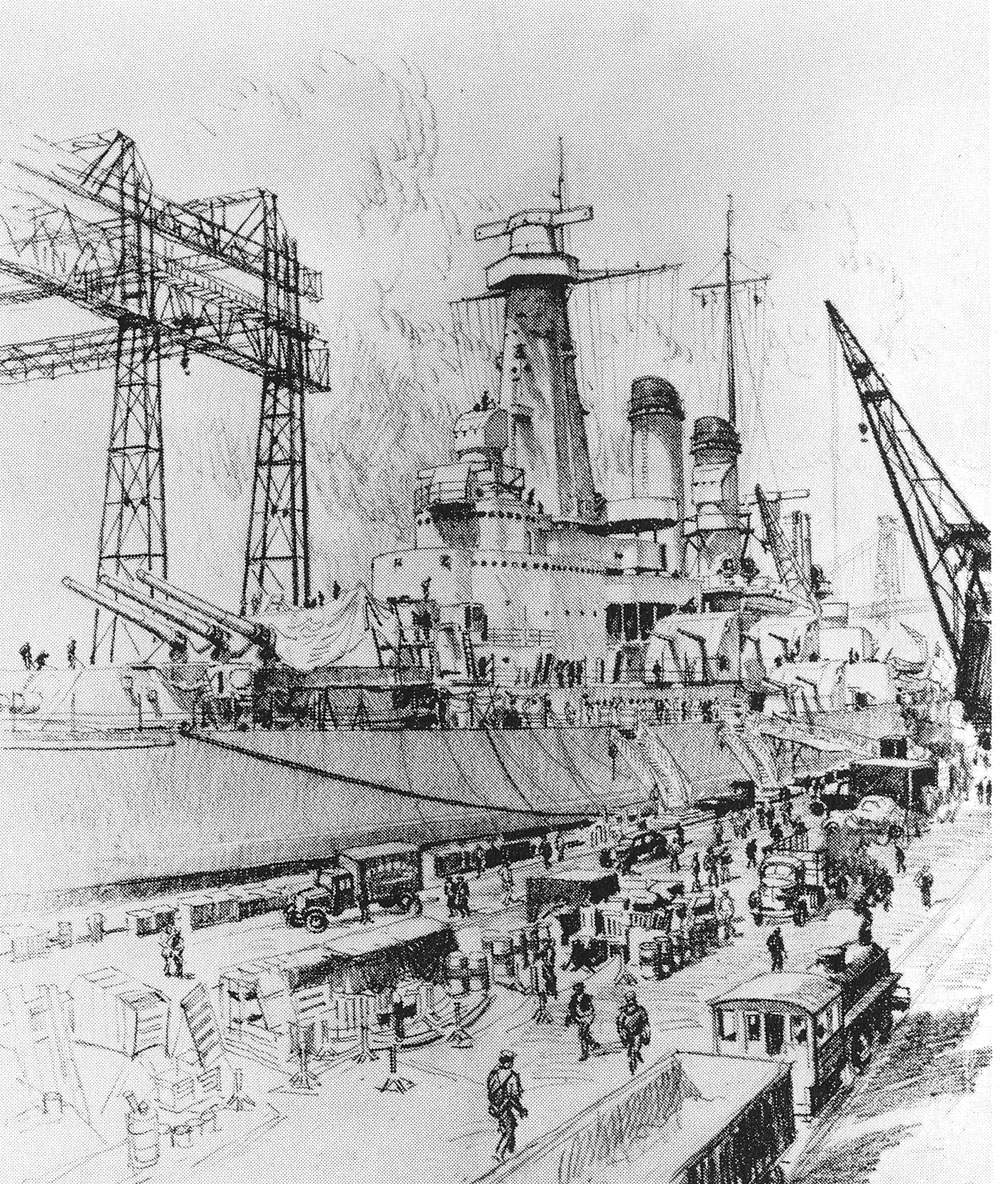 ![]() | 568k | Lots of dockyard activity surrounding the North Carolina (BB-55) as she is fitting out. | Drawing by Vernon Howe Bailey & submitted by Pieter Bakels. | |
