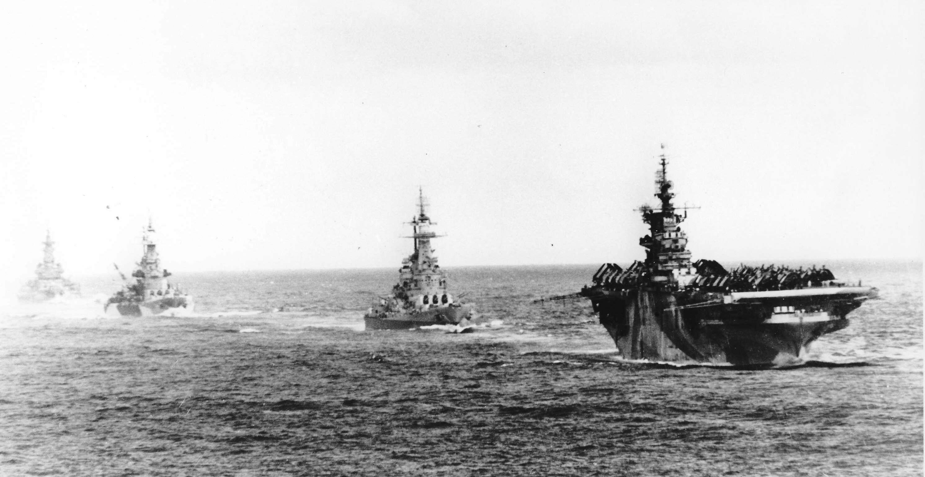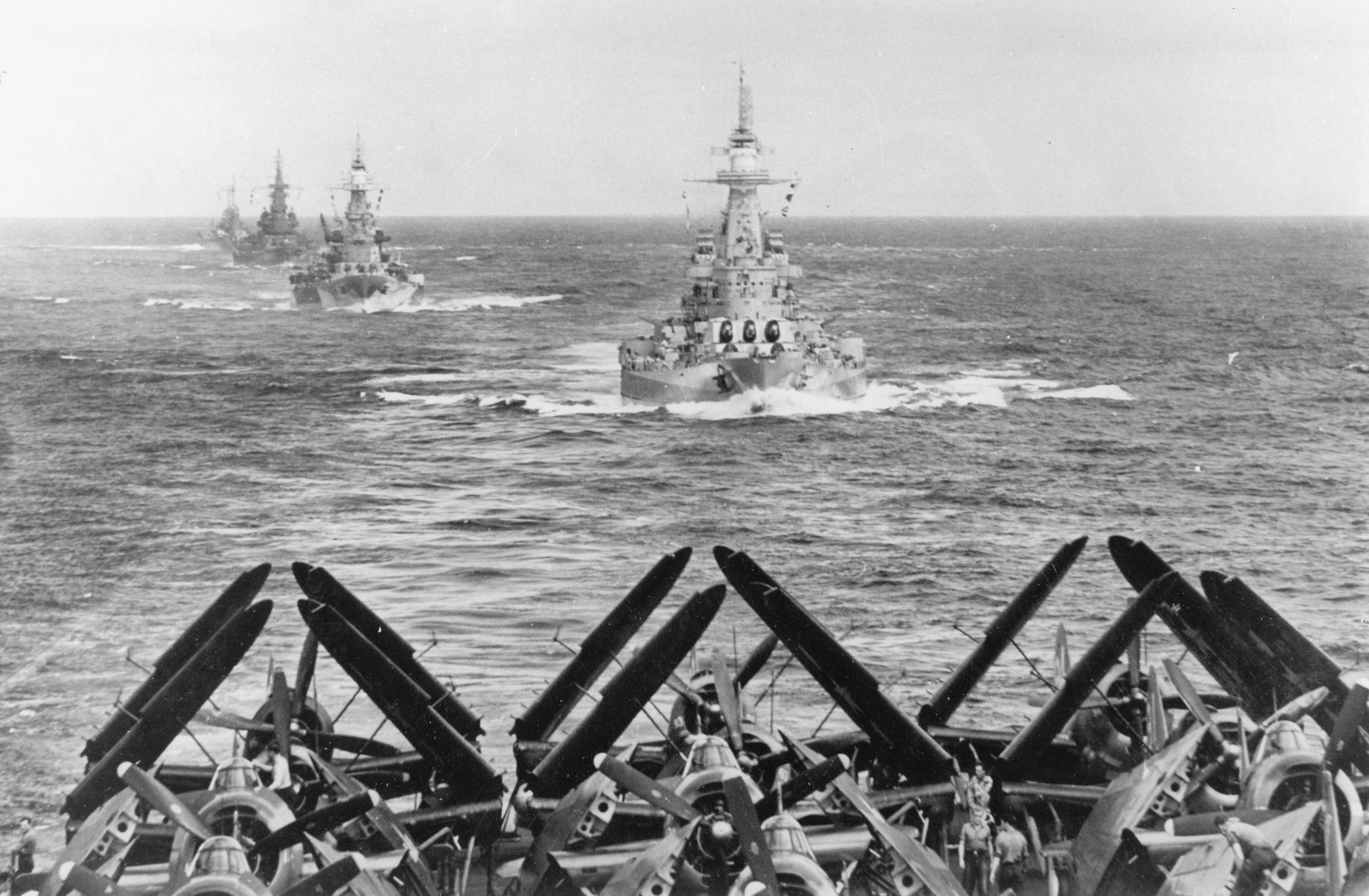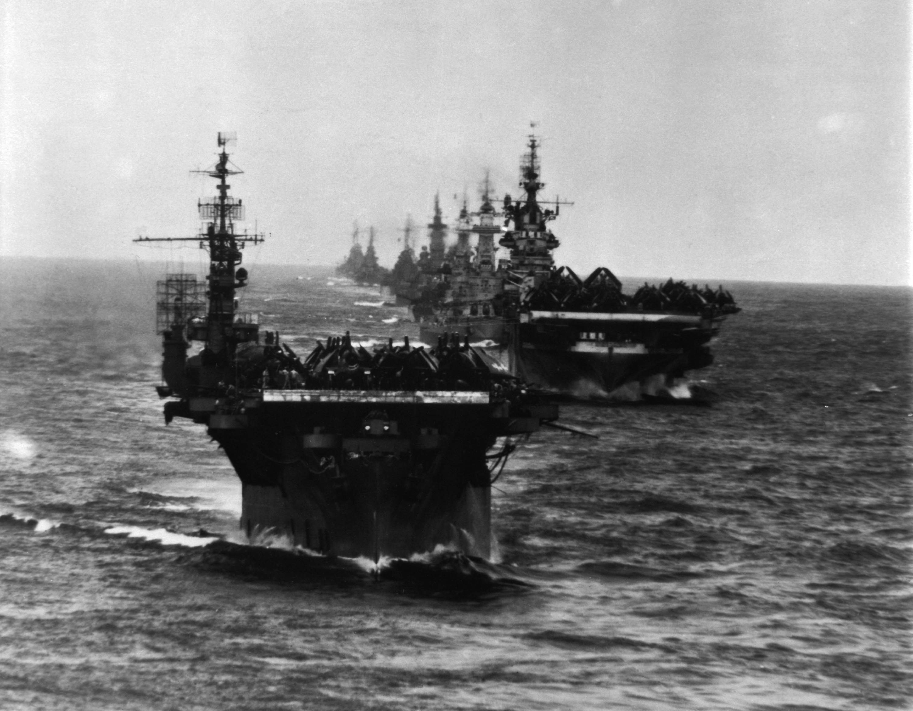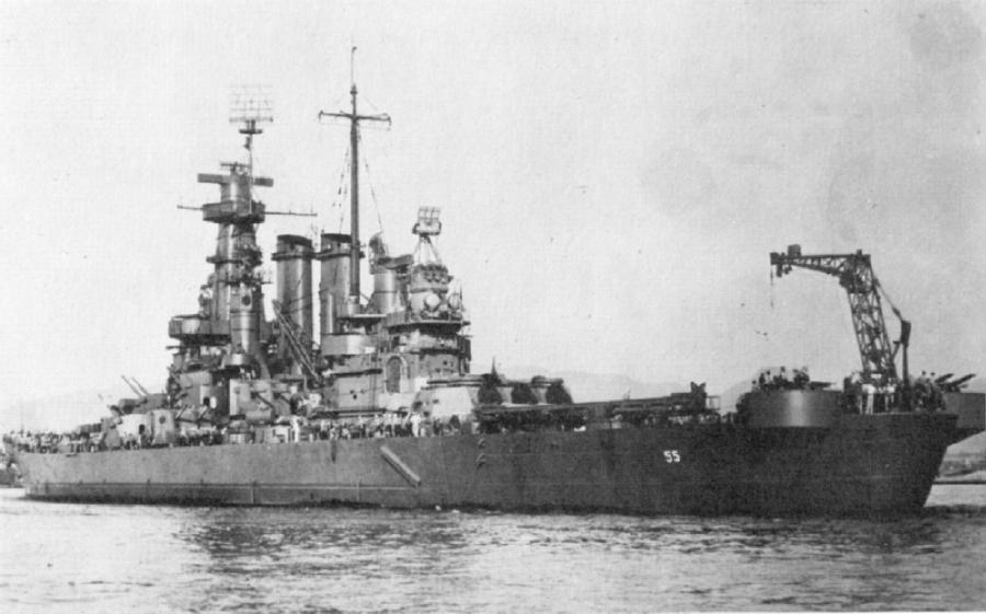 570k | TG 38.3 beginning to reform a column formation after making a simultaneous turn to port. The ships are entering Ulithi Anchorage on 12 December 1944 after strikes against the Japanese in the Philippines. Ships visible in this photo are: Langley (CVL-27); Ticonderoga (CV-14); Washington (BB-56); North Carolina (BB-55); South Dakota (BB-57); Santa Fe (CL-60); Biloxi (CL-80); Mobile (CL-63) and Oakland (CL-95). | None of these can be 12 December. These ships (TG 38.3) departed Ulithi on 11 December. This TG entered Ulithi together on 2 and 24 December. These are likely 24 December 1944 when they're conducting numerous maneuvers and firing exercises while entering Ulithi. Slight chance 2 December but if Oakland (CL-95) is in the picture, she didn't enter with the others on 2 December. One thing for certain, these are not the 11th like the caption on NHHC states. Many open discussions on forums discussing the merits of both dates. Text & ID courtesy of Richard Averitt. USN photo courtesy of Pieter Bakels. |