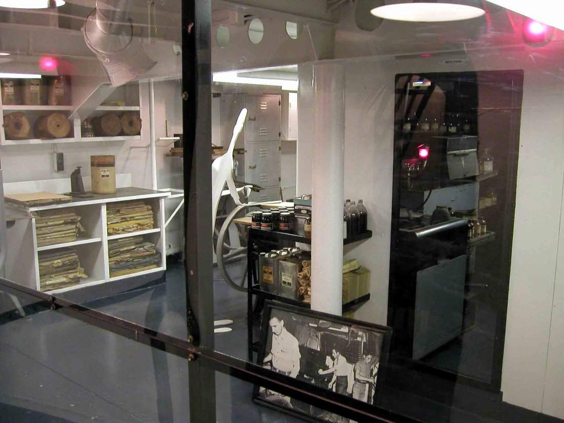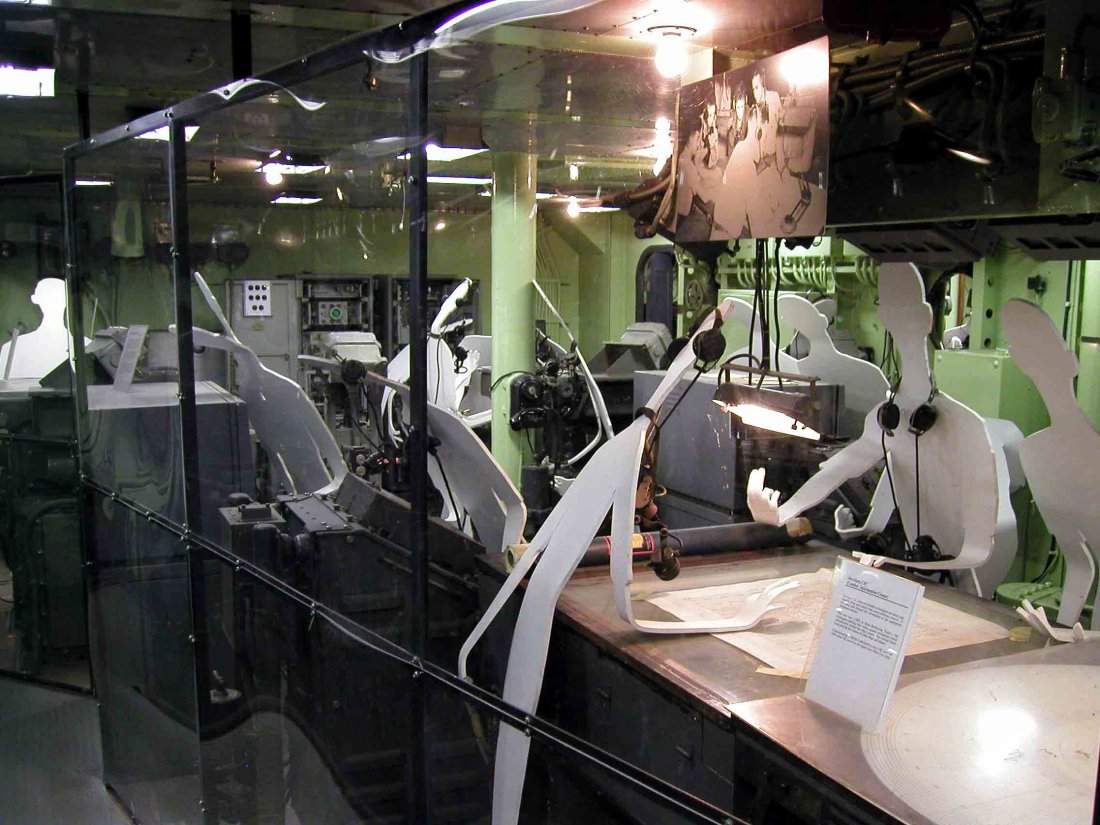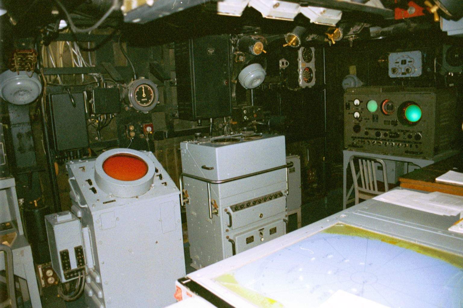 ![]() | 188k | Picture taken of the North Carolina's (BB-55) Combat Information Center (CIC), October 2003. In this picture you can see the Vertical Plot, center of the picture, with status boards left and right. In front from right to left is the CIC's horizontal plot, VG Radar repeater, and DRT. | Courtesy of Joe Hood, USS North Carolina Living History Crew (LHC). | |