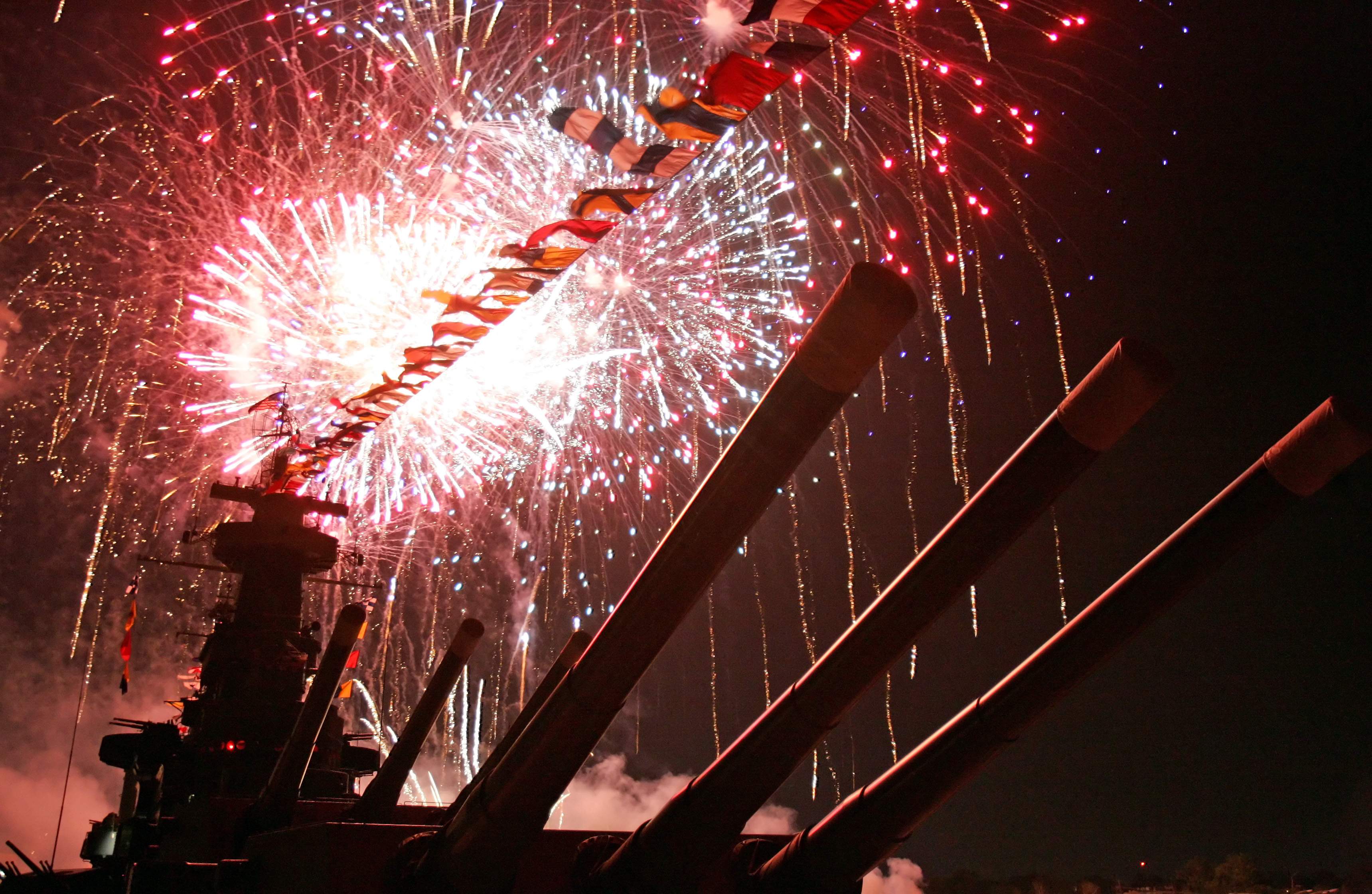 ![]() | 743k | Fireworks illuminate the skies over Battleship North Carolina (BB-55) capping week long celebrations surrounding the commissioning the newest Virginia-class nuclear attack submarine North Carolina (SSN-777) on 3 May 2009. North Carolina will be homeported in Groton, Conn., as a member of the U.S. Atlantic Fleet. | USN photo # N-7441H-001 by Mass Communication Specialist 2ND Class Roadell Hickman, courtesy of navy.news.mil. | |