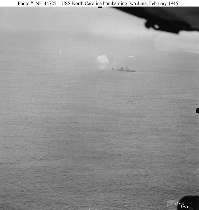 ![]() | 47k | North Carolina (BB-55) firing her forward sixteen-inch guns while bombarding Iwo Jima, circa 19-22 February 1945. | Official USN photo # NH 44725. | |