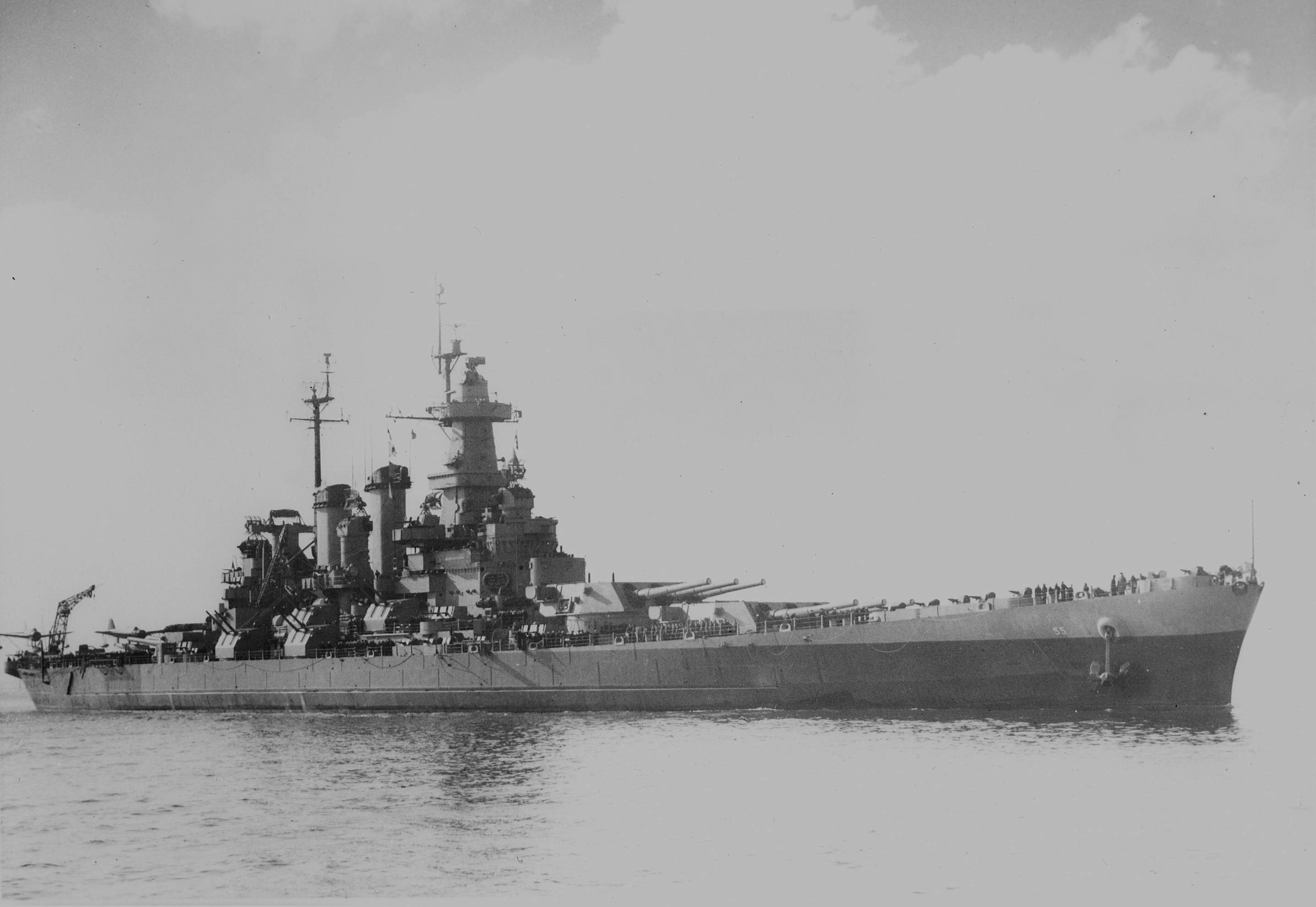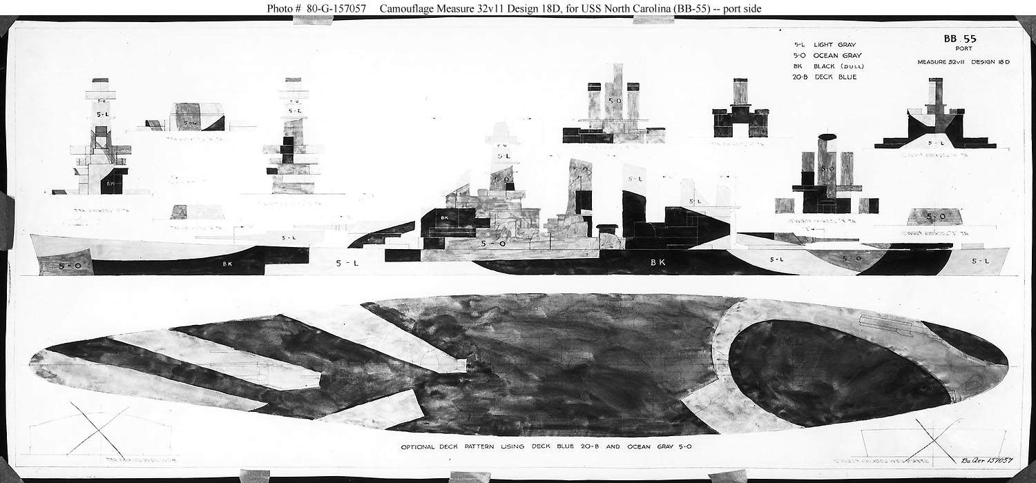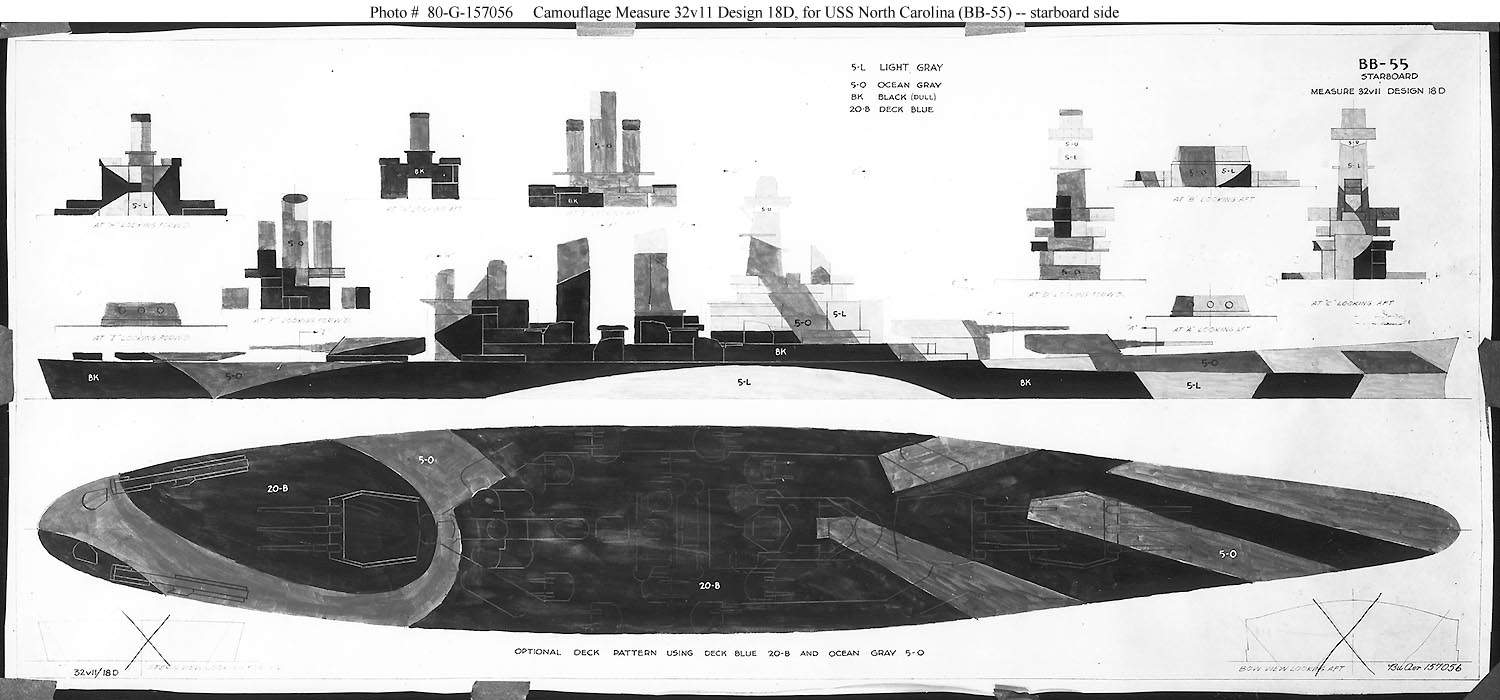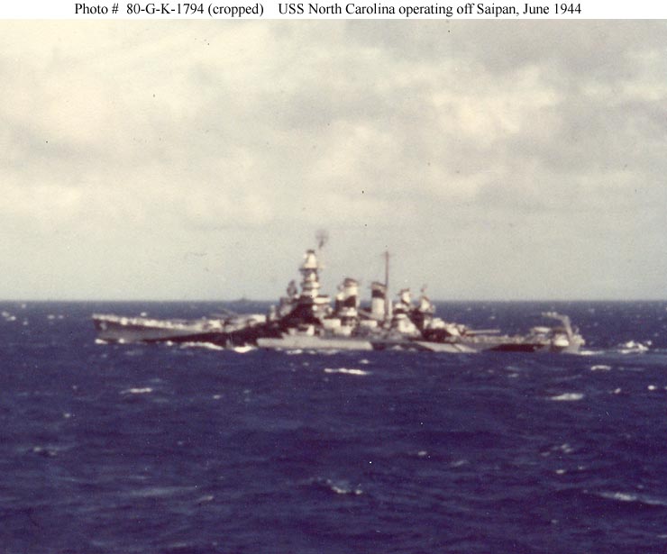![]() | 52k | North Carolina (BB-55) operating off Saipan in June 1944. Note the camouflage pattern applied to her port side. This image has been cropped to emphasize the ships and their camouflage patterns. | Official USN photo # 80-G-K-1794, now in the collections of the National Archives. | |