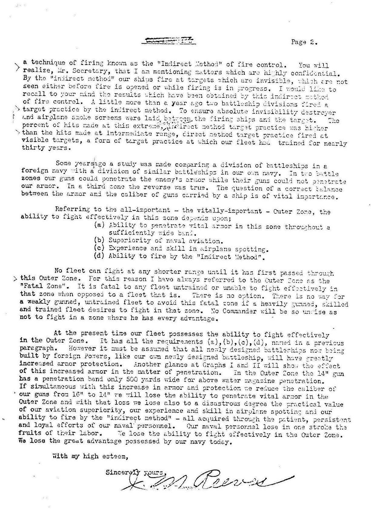 ![]() | 423k | Page 2 of a 2 page letter from Admiral J.M. Reeves, the senior member of the General Board of the Navy Department to Sec.Nav Charles A. Swanson to give to President Franklin D. Roosevelt stating the case for 16" main armament over 14". FDR did not want the U.S. to be the first power to violate the Washington & London Naval treaties concerning gun limitations. | Photo and text from the article "Gun Calibers & Battle Zones; The USN's Foremost Concern During the 1930's", by Professor Malcolm Muir Jr., courtesy of Warship International, pg. 26. No. 1, 1980. | |