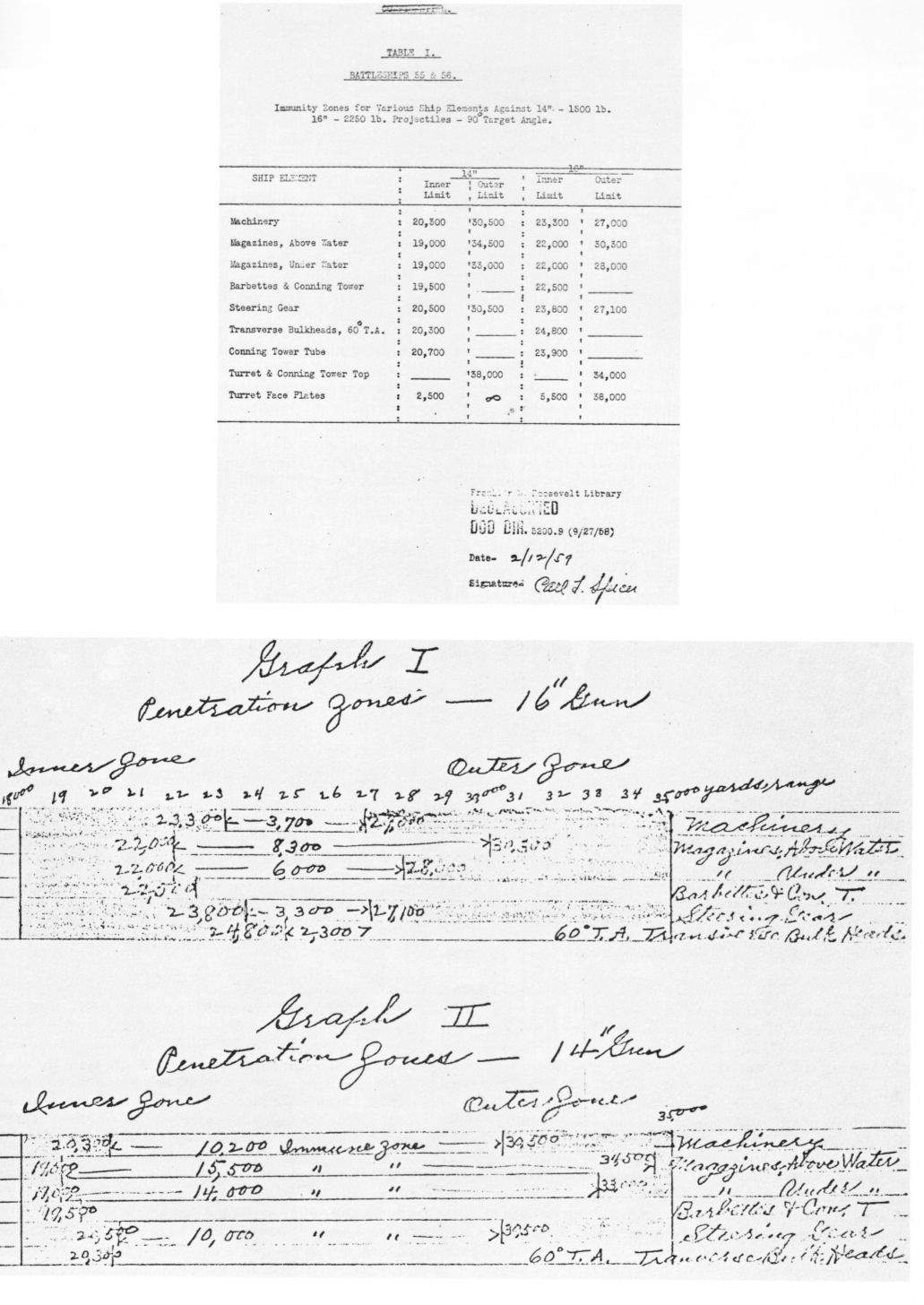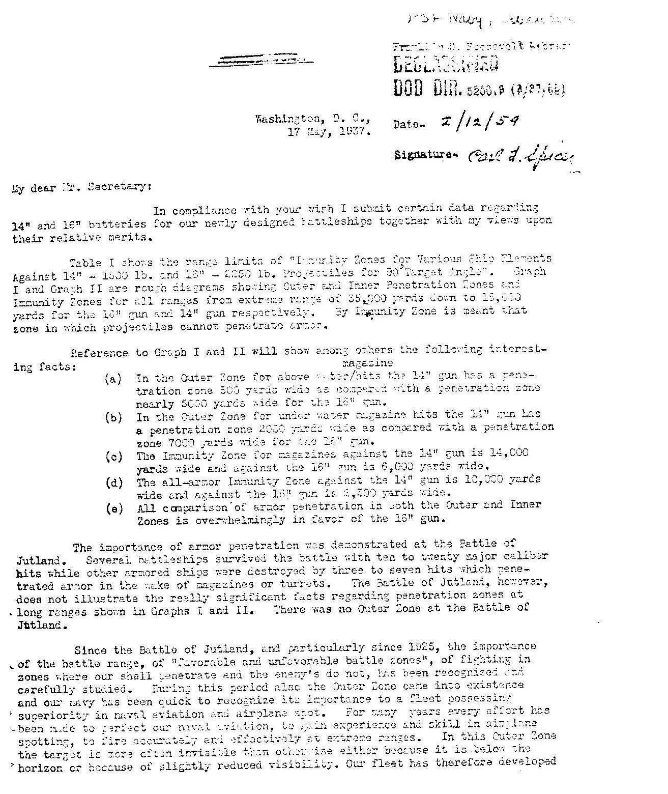 ![]() | 154k | Table of Immunity Zones of a 14" vs a 16" shell in a letter from Admiral J.M. Reeves, the senior member of the General Board of the Navy Department to Sec.Nav Charles A. Swanson to give to President Franklin D. Roosevelt stating the case for 16" main armament over 14". FDR did not want the U.S. to be the first power to violate the Washington & London Naval treaties concerning gun limitations. | Photo and text from the article "Gun Calibers & Battle Zones; The USN's Foremost Concern During the 1930's",by Professor Malcolm Muir Jr., courtesy of Warship International, pg. 27. No. 1, 1980. | |