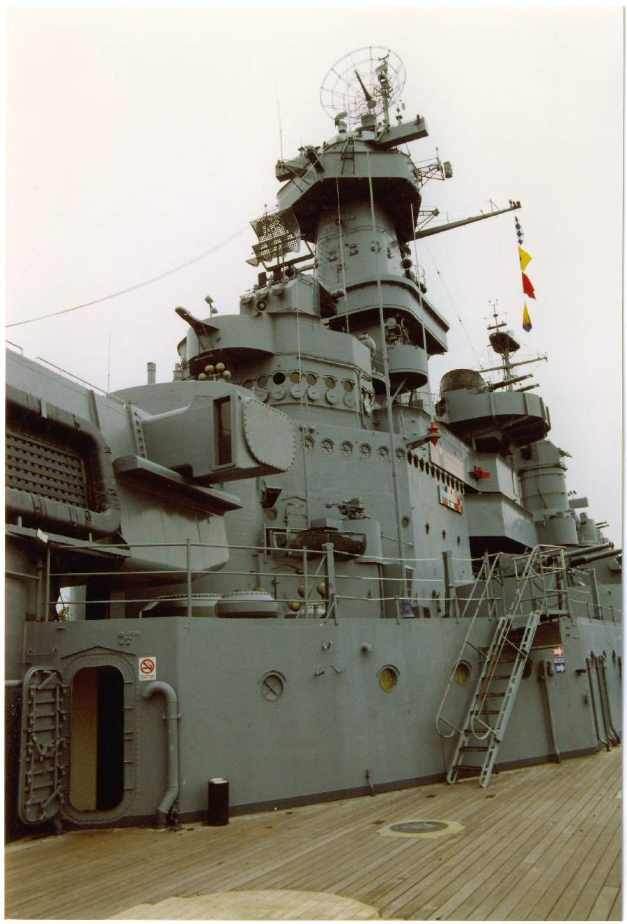 ![]() | 197k | View from the bridge showing gun directors, the forward 16-Inch turrets & anchor capstans. | USN photo courtesy of Pieter Bakels. | |