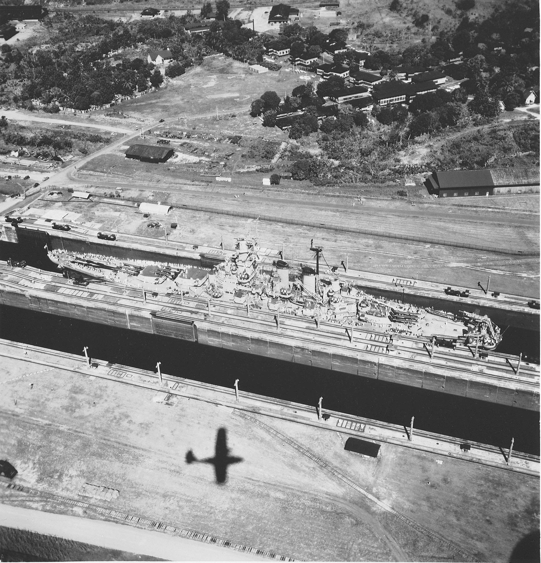 ![]() | 602k | Dated 11 October 1945 "North Carolina (BB-55) Task Force 11 transiting the Panama Canal on return from Pacific combat operations." The tight fit of the Canal's locks are evident here and this width limited the beam of United States battleships on 'all' classes, except the proposed, but never built, Montana class (BB-67 / 71) of 1940. Note the shadow of the PBY that probably took this photo. | USN photo # CS 16899 courtesy of David Buell. | |