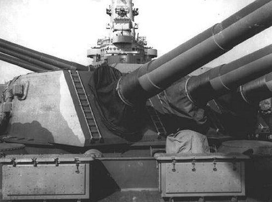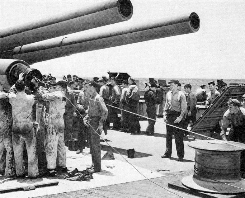 ![]() | 88k | Cleaning the main battery barrels, July, 1945. Note the camouflage counter shading on the barrels. | USN photo. | |