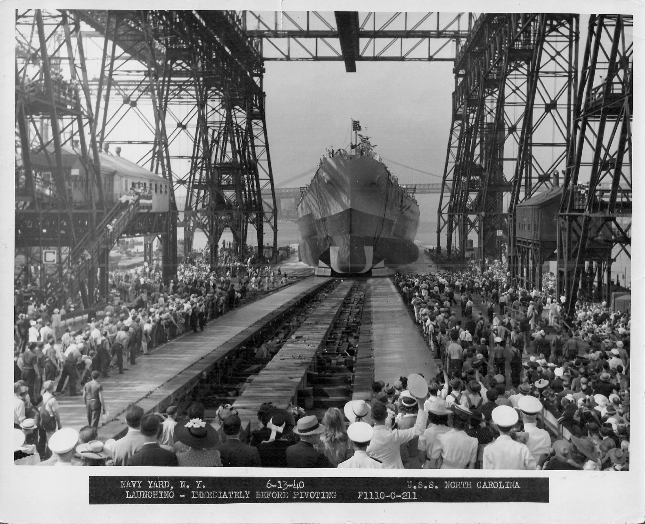 ![]() | 95k | New York Navy Yard NY. On building ways three days before launching, 11 June 1940. | NARA (National Archives Record Administration) photo courtesy of battleshipnc.com. | |