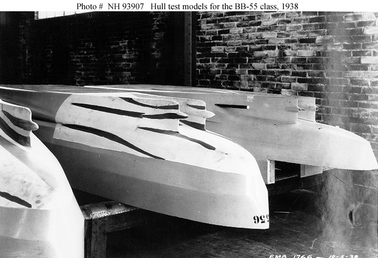 ![]() | 76k | Hull test model for the North Carolina class battleships Hull model numbers 3557, 3556 and 3460, photographed at the Experimental Model Basin, Washington Navy Yard, Washington, D.C., 5 October 1938. These models show the "twin skegs", supporting the inboard propeller shafts, that were developed for this battleship design. Flow lines are marked on hull model numbers 3557 and 3556. Copied from the Bureau of Ships monograph "United States Battleship Designs for World War II", dated 1 June 1946. | Naval History and Heritage Command # NH 93907. | |